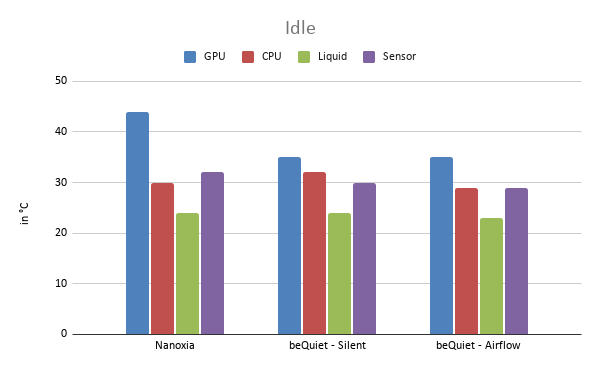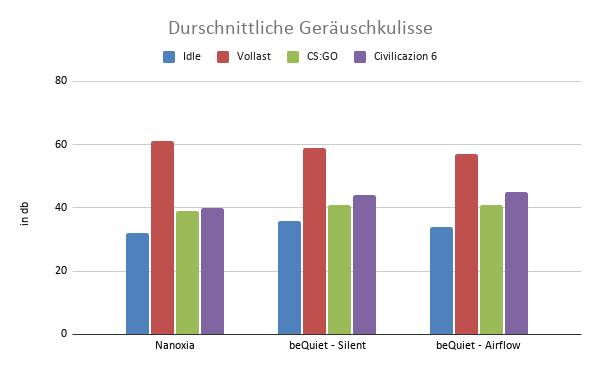 | 6. technischer Vergleich der Gehäuse Den technischen Vergleich habe ich mithilfe eines Lautstärke- und Hitze-Tests durchgeführt. Diese Auswertung fand im Idle [ca. 700RPM], unter Volllast (Prime95 + FurMark) [ca. 1100 RPM], in CS:GO und Civilization 6 statt. Alle Werte wurden nach 10min Laufzeit notiert. Die Drehgeschwindigkeit des Lüfters habe ich bei den Spielen automatisch steuern lassen. Da mein Gigabyte B450 Aorus Elite anfangs Probleme mit der Lüftersteuerung hatte, wurden Y-Adapter verwendet um die Lüfter über die verfügbaren Sys-Fans auf dem Board direkt anzusteuern. Das Lüfter-Hub wurde für diesen Test nicht komplett verwendet. Die Hardware, welche im Test verwendet wurde, steht unter #1 oben im Beitrag. Optisch sieht das Setup wie folgt aus: Für den Lautstärketest habe ich die iOS-App „db Meter“ verwendet. Mir ist bewusst, dass diese ggf. nicht zu 100 % geeicht ist. Jedoch bleiben die relativen Unterschiede zwischen den Gehäusen natürlich gegeben. Daher lassen sich problemlos Vergleichswerte in Relation stellen. Hierbei gilt natürlich, je geringer die db-Zahl, desto besser. Den Durchschnitt habe ich durch die Messung der Lautstärke an der Front, Seite und Oben ermittelt. Dadurch, dass bei der Silent Base die AIO an der Decke verbaut ist, fehlt oben eine Dämmung. Deutlich wird das bei dem Lautstärketest. Die Geräuschkulisse war bei dem bequiet-Gehäuse an der Oberseite immer am Höchsten. Der Hitze-Test wurde etwas komplexer aufgezogen. Dafür wurde für jeden Testaufbau die GPU, CPU, das WaKü-Liquid und ein Temperatursensor am unteren PCIe-Anschluss in „°C“ ausgewertet. Wie auch beim DB-Test gilt, je geringer der Wert, desto besser. Zu guter Letzt sind anbei noch die Werte des SSD-Performance-Tests. Diesen hatte ich in der Bewerbung als Tool zur Beurteilung der Hitzeentwicklung angeführt. Vorneweg, trotz maximaler Auslastung der CPU und GPU arbeitet die Crucial P1 SSD im CrystalMark-Benchmark zügig die 32 GB ab. Und zeigt kaum Ermüdungserscheinung trotz erhöhter Gehäusetemperatur. Die SSD-Temperatur stieg im Test auf maximal 45 °C (lt. CrystalDiskInfo) Aktuelles Setup: Mainboard: MSI B550 A-Pro CPU: AMD Ryzen 5600x AIO: Alpenföhn Gletscherwasser 280 GPU: XFX RX6700 XT RAM: 64 GB Corsair Dominator 3200 MHz SSD: 2 TB Kingston Fury Renegade M.2 NVMe Peripherie: Beyerdynamic DT990 Black Edition + Soundblaster X5 |