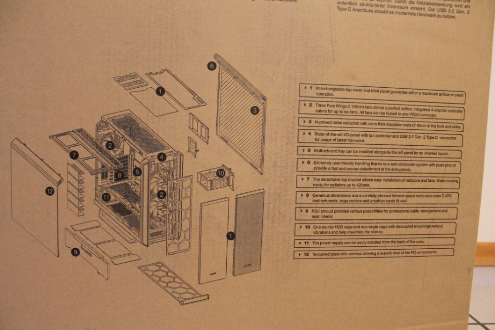 | 2. Lieferumfang Neben den diversen Modulen (Top-Cover, Front-Cover, PSU-Verkleidung) ist zusätzlich ein HDD-Käfig für 2 HDDs verbaut und ein weiterer Käfig für eine HDD ist im Lieferumfang. Ferner sind verschiedene Schrauben im Lieferumfang. Lieferumfang (Kleinteile): 6x Klettbänder für das Kabelmanagement 12x HDD-Schrauben 12x M3-Schrauben für die SSD 12x 6#32-Schrauben für das Mainboard und Netzteil 4x Gummiunterleger für die entkoppelte HDD-Montage Des Weiteren befinden sich 3 vorinstallierte Pure Wings 2 (140 mm) im Case. Davon sind zwei an der Front und einer auf der Rückseite des Gehäuses montiert. 3. Features der Silent Base 802 (Window) Wie im vorherigen Punkt schon angesprochen, hat man bei der Silent Base die Möglichkeit das Gehäuse modular anzupassen. Somit kann man nach persönlicher Präferenz entscheiden, wo man lieber eine gedämmte Wand oder eben eine luftdurchlässige Seite hat. Allgemein weist die Silent Base folgende technische Spezifikationen auf: Ein weiteres Feature der Silent Base 802 ist der integrierte Lüfter-Hub auf der rechten Seite des Gehäuses. Über dieses lassen sich via PWM bis zu 6 Lüfter anschließen und ansteuern. Leider hat dies bei mir aufgrund des verwendeten Mainboards (B450 Aorus Elite) nicht einwandfrei funktioniert. Im Automatik-Modus liefen die angeschlossenen Lüfter immer auf 100 %. Per manueller Stufenregelung hat eine RPM-Regulierung aber funktioniert. Aus diesem Grund habe ich die Lüfter über Y-Adapter direkt an das Mainboard angeschlossen, um die Drehzahl nicht händisch regulieren zu müssen. Des Weiteren bietet das I/O-Panel an der Front neben HD-Audio, 2x USB 3.0 auch 1x einen USB-Typ C-Anschluss. Dieser wurde aufgrund des fehlenden USB 3.0 Gen2-Steckplatz an der Hauptplatine nicht betrieben. Für mich persönlich sind ein positiver Aspekt die mannigfaltigen Montagemöglichkeiten für Radiatoren. Neben der (optimalen) Lösung einer Deckenmontage, stehe auch noch Front- und Heckplätze zur Verfügung. Aktuelles Setup: Mainboard: MSI B550 A-Pro CPU: AMD Ryzen 5600x AIO: Alpenföhn Gletscherwasser 280 GPU: XFX RX6700 XT RAM: 64 GB Corsair Dominator 3200 MHz SSD: 2 TB Kingston Fury Renegade M.2 NVMe Peripherie: Beyerdynamic DT990 Black Edition + Soundblaster X5 |