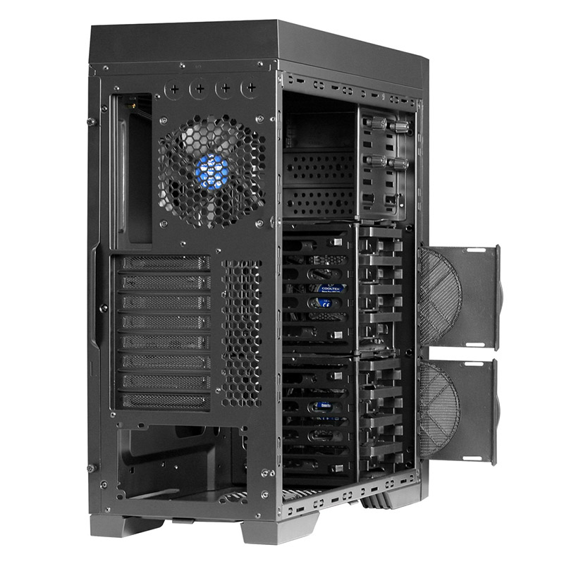 Der Midi-Tower besitzt am Frontpanel 2x USB 3.0, 2x USB 2.0 sowie HD-Audio Anschlüsse. Der Innenraum ist wie schon das Äußere in schwarz lackiert und bietet viel Platz für Highend-Hardware. Grafikkarten können bis zu 300mm lang sein, CPU-Kühler dürfen maximal 165mm hoch sein. Wenn man einen oder beide HDD-Cages ausbaut hat die GraKa sogar bis zu 430mm. Cooltek bietet dafür sogar eine Sicherung an, die lange Karten besser halten können. Insgesamt finden acht 2,5“- oder 3,5“-Laufwerke im Gehäuse ihren Platz, extern stehen drei 5,25 Zoll Schächte zum Einbau von optischen Laufwerken zur Verfügung. Für Erweiterungskarten finden sich an der Gehäuserückseite acht PCI-Slots wieder.