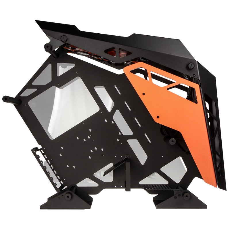 Der Rahmen des Cougar Conquer wird mittels CNC-Fräse aus Aluminium hergestellt und in orange und schwarz lackiert. Dabei wird das Mainboard im Inneren um 45° verdreht verbaut. Unterstützt werden Formate bis ATX. Grafikkarten können sogar bis 350mm Länge vorweisen. Da insgesamt sehr viele Öffnungen und Glaselemnte vorhanden sind, ergeben sich viele Einsichtsmöglichkeiten auf die verbaute Hardware. Bei der Glasscheibe wird auf 5mm dickes gehärtetes Glas vertraut.
