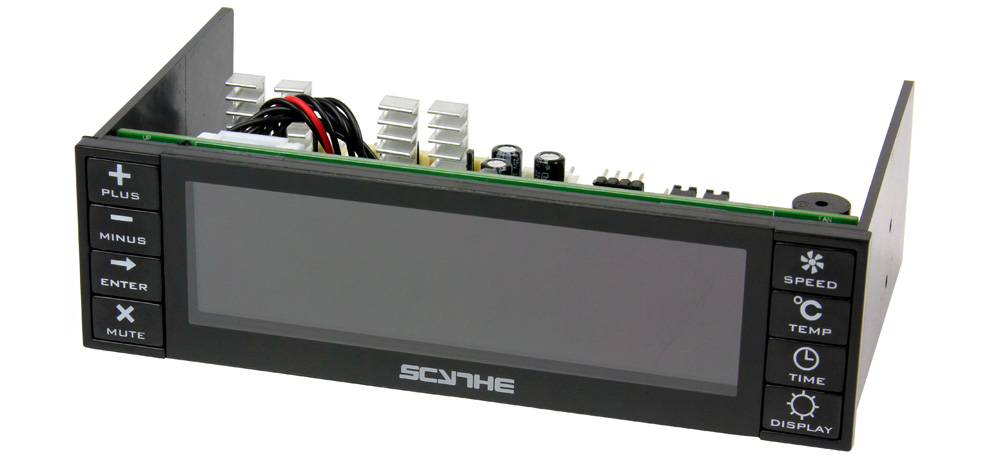 Die multifunktionale Lüftersteuerung verfügt über je vier Lüfter- und Temperaturkanäle und besitzt einen Drehzahlbereich von 0 bis 9.990 U/min. Die Eingangsspannung beträgt 5 und 12 Volt, die Ausgangsspannung zwischen 5 und 12 Volt. Bedingt durch die „12 Volt Spin-up“-Funktion starten die angeschlossenen Lüfter zuerst mit der vollen Spannung, bevor in den eingestellten Spannungsbereich gewechselt wird. Scythe hat zudem auch an die Sicherheit des Rechners gedacht und der Lüftersteuerung eine „Power Feed Control“-Funktion spendiert. Hierbei werden Lüfter, die innerhalb von 15 Sekunden keine Umdrehungszahl erreichen, automatisch von der Stromzufuhr getrennt. Somit werden defekte Modelle sofort erkannt, sodass sie keine Gefahr mehr für den PC darstellen.