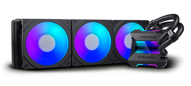 Das optische Highlight der Kühlung ist der Deckel der Kühler-Pumpen-Kombi sowie die bis zu drei Halo D-RGB-Lüfterrahmen. In Verbindung mit den insgesamt 14 digital adressierbaren RGB-LEDs können so beeindruckende Effekte entstehen. Die schwarzen D-RGB-Lüfterrahmen besitzen jeweils 30 RGB-LEDs und die Beleuchtung lässt sich mit einem PHANTEKS-RGB-Controller oder mit der Software eines kompatiblen Mainboards steuern.