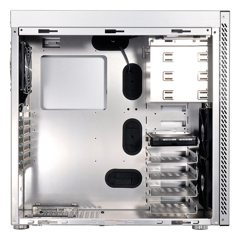 Beide Gehäuse ähneln sich wie Geschwister, der Unterschied besteht lediglich beim B16, das mit einer zusätzlichen Tür ausgestattet ist. Lian Li setzt hier auf die Modularität der Gehäuse, dass heißt es ist möglich einzelne Festplattenhalterungen zu entfernen und zusätzlich zu verlegen, um so beispielsweise mehr Platz für längere Grafikkarten zu schaffen. Wenn man den 5,25"-Käfig ganz entfernt hat, bietet das Gehäuse genügend Platz für Grafikkarten, die länger als 280mm sind. Außerdem möchte Lian Li weitere Möglichkeiten für zukünftige Entwicklungen offen halten.