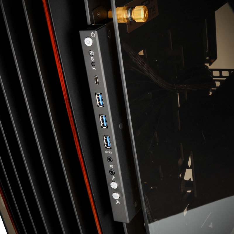 Das Grundgerüst des offenen Gehäuses bildet sich aus neun Aluminiumlamellen, die an beiden Seiten mit Hartglas-Scheiben umschlossen werden. Eine bernsteinfarbene LED-Beleuchtung beleuchtet das Gerüst und kann an der Front des Gehäuses in sechs unterschiedliche Intensitäten eingestellt werden. Das Frontpanel ist neben der üblichen Kopfhörer- und Mikrofon-Buchsen auch mit USB 3.0-Anschlüssen sowie einem USB 3.1 Typ-C Port bestückt. Für eine optimale Kühlung bietet das Case einen 360mm Montageplatz im Deckel sowie einen 120mm Ausschnitt in der Rückseite. Speichermedien finden in den Kombi-Slots Platz, hier kann man bis zu sechs 2,5- bzw. 3,5-Zoll-Festplatten installieren.