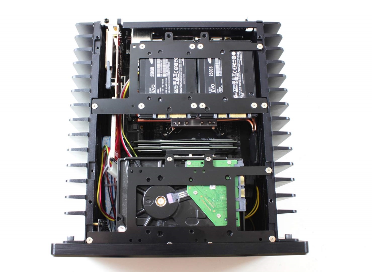 Die Außenmaße des Gehäuses belaufen sich auf 270 x 264 x 93mm. Aufgenommen werden daher Mini-ITX Mainboards. Die Kühlung übernehmen die Aluminium-Rippenkühler auf beiden Seiten. Sie werden über sechs Heatpipes mit der CPU in Verbindung gebracht. Der Hersteller sieht maximal CPUs mit einer TDP von 80W vor.