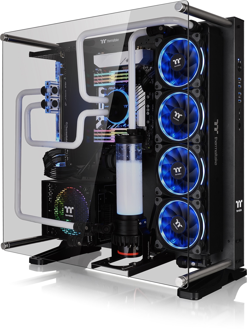 Da die Präsentation des Systems im Fokus des Gehäuses steht, kann man im Inneren bis zu drei Kombo-Einbauplätze auffahren (2,5”/3,5”). Neu ist auch, dass man nicht nur die Grafikkarten in ihrer Einbauposition variieren kann, sondern auch das Mainboard. Gleiches gilt auch für das Netzteil, sollte man ein Mini-ITX Brett verbauen. Da Wasserkühlung oft eine hohe Beachtung bei vorzeigbaren Systemen darstellt, kann das modulare P5 TG TI Radiatoren bis zu 480mm aufnehmen und auch mit großen Pumpen bestückt werden. Zu den Neuerungen gehört auch, dass man am Front-Panel nun viermal USB 3.1 Gen.1 vorfindet, wobei USB 2.0 über einen Y-Adapter weiterhin verfügbar ist.