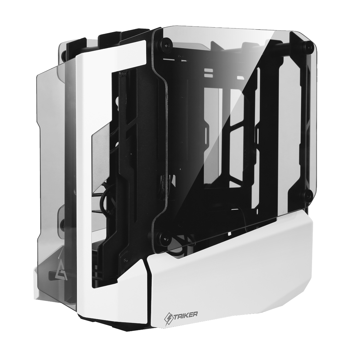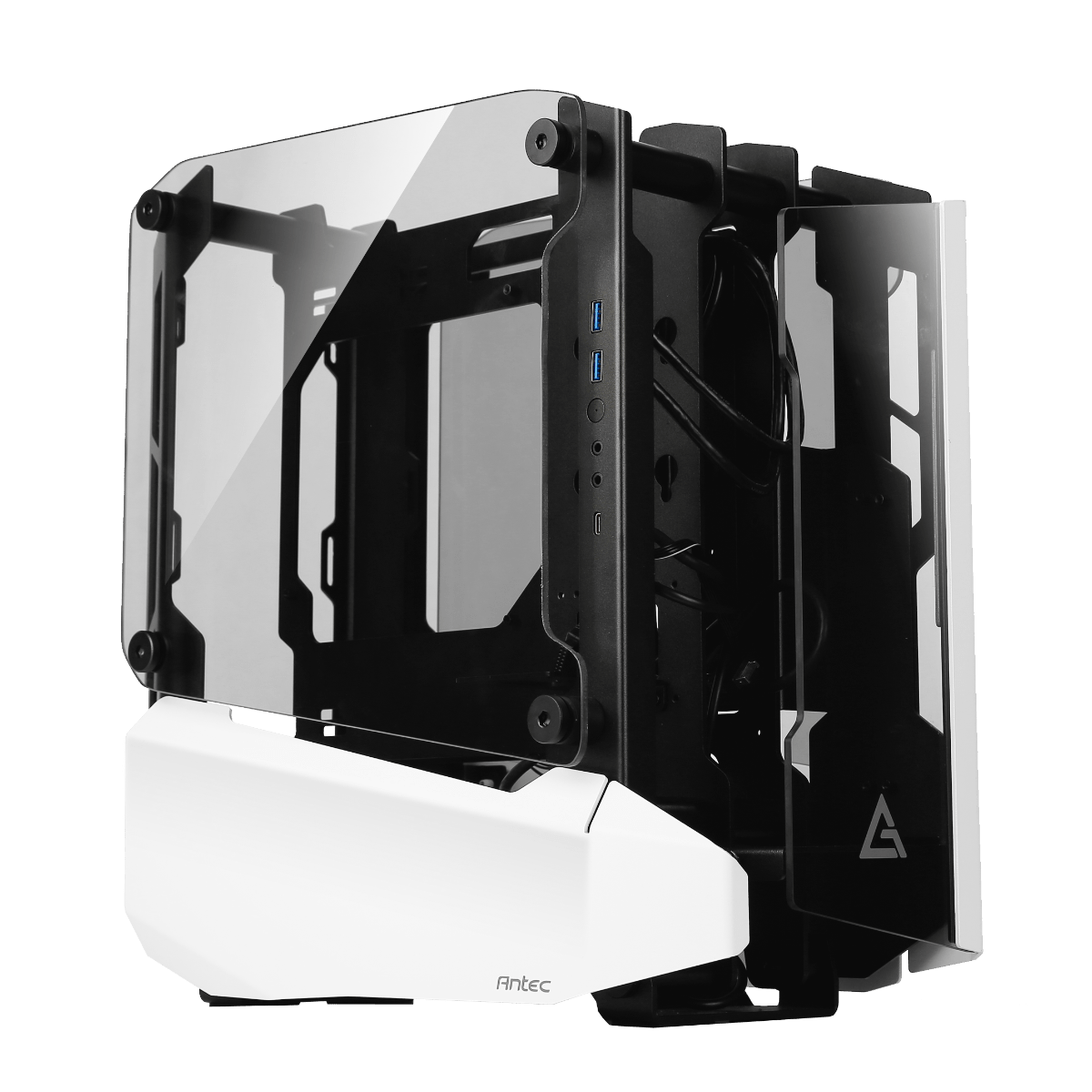 Das Antec Striker setzt auf einen Stahlrahmen, welcher schwarz Beschichtet wird. An diese schließen sich an den Außenseiten 4mm dicke Glasscheiben sowie weiße Aluminium-Panele an. Insgesamt nimmt der Mini-Tower den Raum von 420 x 230 x 410 mm ein. Da er als Open-Frame ausgelegt ist, wird viel Belüftung geboten, allerdings auch viele Öffnungen für Staub. Trotz der kompakten Abmessungen zielt Antec auch auf Nutzer von Wasserkühlungen ab. Um dies zu ermöglichen, hat man den Aufbau etwas verändert.