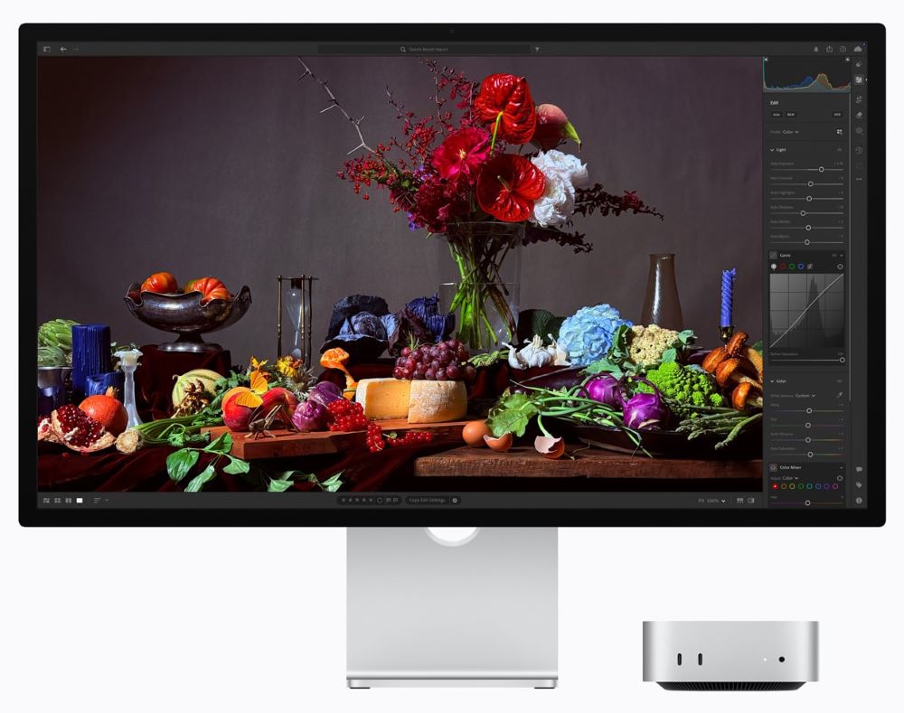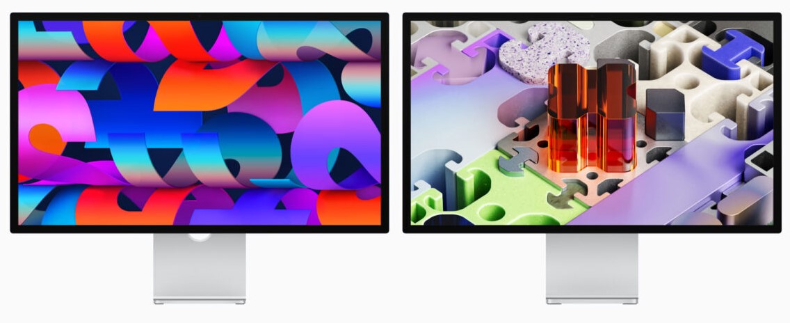 Das aktualisierte Studio Display bleibt bei einem 27 Zoll großen 5K-Retina-Panel mit 5120 x 2880 Pixeln und mehr als 14 Millionen Bildpunkten. Die maximale Helligkeit liegt bei 600 Nits, unterstützt wird der P3-Farbraum. Zur Ausstattung zählen eine 12 Megapixel Center Stage Kamera mit Desk View Funktion, ein Drei-Mikrofon-Array sowie ein Sechs-Lautsprecher-System mit Spatial Audio.