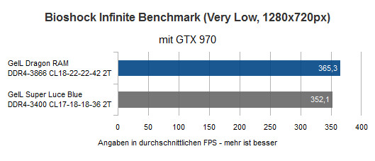 Im 3D-Test konnte das GWW48GB3866C18DC Kit nur teilweise überzeugen und schneidet dort mit 10738 Punkten im 3DMark 11 und 75,29 FPS im Bioshock Infinite Benchmark etwa 10 % schlechter ab. Gründe dafür könnten die geringe Speicherkapazität und die Timings im Zusammenspiel mit unserem Testsystem ohne externe GPU sein. Da wir uns mit diesem Ergebnis noch nicht zufrieden geben, bauen wir für einem weiteren Test eine GTX 970 von Palit ein und jagen beide Kandidaten noch einmal durch zwei Benchmarks.