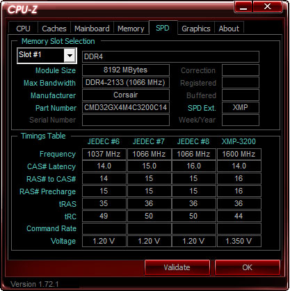 Das uns vorliegende Corsair Dominator Platinum Special Edition Torque Kit CMD32GX4M4C3200C14T verrichtet ab Werk seine Arbeit mit 3200 MHz bei Latenzen von CL 14-16-16-36. Um diese Settings stabil betreiben zu können, wird eine Spannung von 1,35 V angelegt. Im Speicherinterface finden sich wie gewohnt über den XMP-2.0-Standard verschiedene JEDEC-Vorsteinstellungen, die kinderleicht über das UEFI/BIOS an die Speichermodule angelegt werden können.
