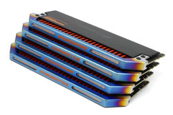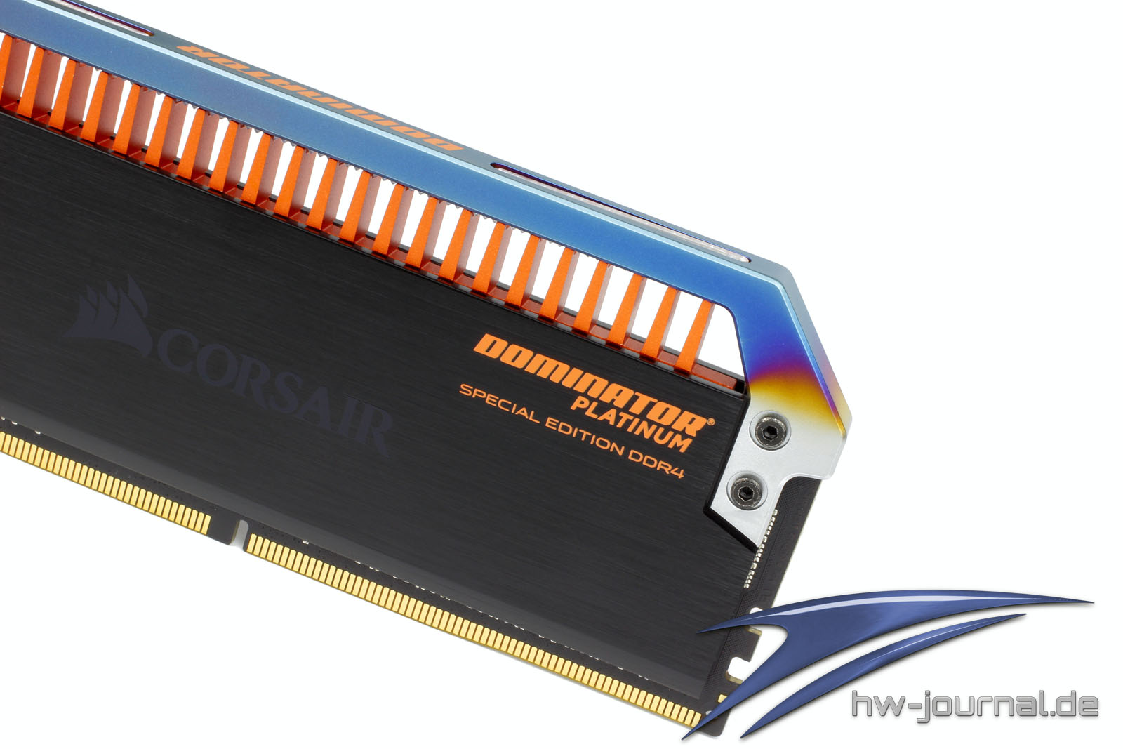 Die Top Bar ist dem Farbschema entsprechend aufgestylet und erinnert an einen hitzebehandeltes Metall. Anstatt einer durchgehenden Aluminiumdecke und indirekt beleuchteter Light Pipe, sind bei den Torque Speichermodulen zwei LED Kunststoffelemente eingelassen die ein Durchscheinen der integrierten weißen LED Beleuchtung zulassen. Direkt darunter befinden sich orangene statt schwarze Kühl-Lamellen. Die Sidepanels aus massivem Aluminium erstrahlen auf beiden Seiten in einem einheitlich schwarzen gebürsteten Aluminiumlook mit Corsair-Logo und orangenem "Dominator Platinum Special Edition DDR4" Schriftzug.