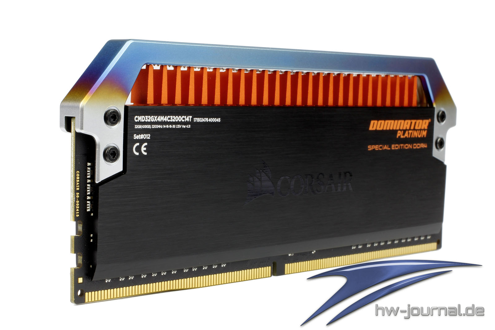 Besonders hervorzuheben ist auch das ausgefallene Design der Riegel. Das schwarze 10-Layer PCB wirkt zusammen mit den Sidepanels sehr edel und hochwertig. Für einen außergewöhnlichen Look sorgen zum einen die orangenen Schriftzüge auf den Aluminiumabdeckungen sowie die orangfarbene Lamellen. Insgebondere der ungewöhnlich designte Light-Pipe, die an ein wärmebehandeltes Metall erinnert, sticht deutlich hervor. Zu kaufen gibt es das Corsair Dominator Platinum Special Edition Torque Kit CMD32GX4M4C3200C14T nur in limitierter Auflage und zu einem Herstellerpreis von 499,99 €. Wer also noch ein solches Kit sein eigen nennen möchte, der sollte sich beeilen.