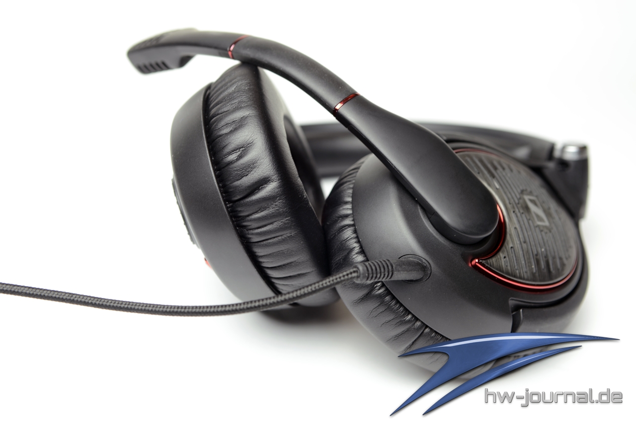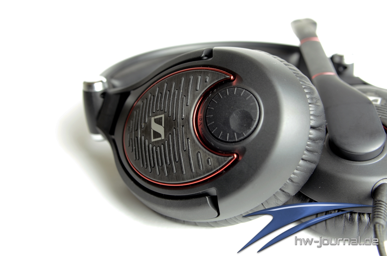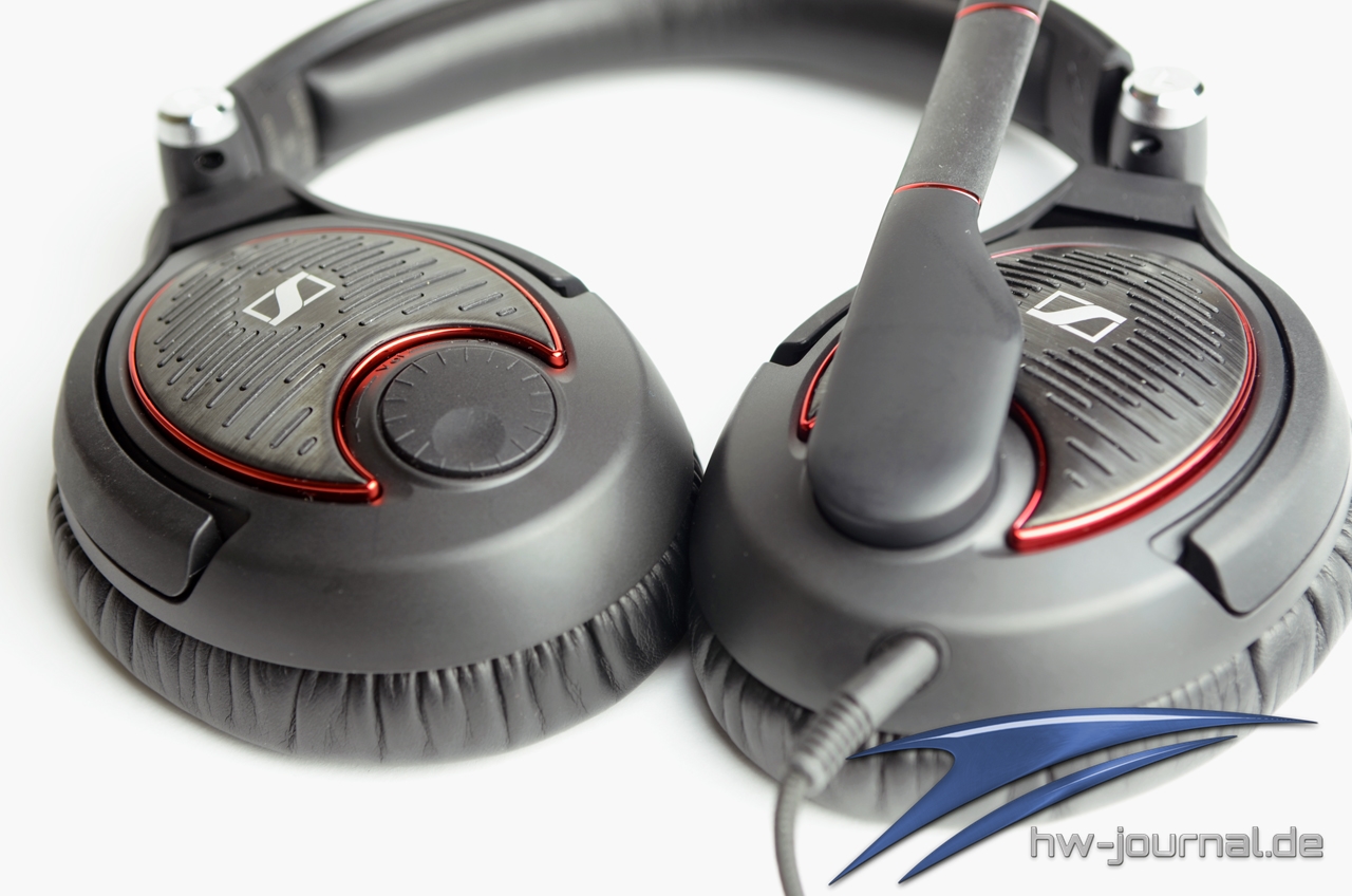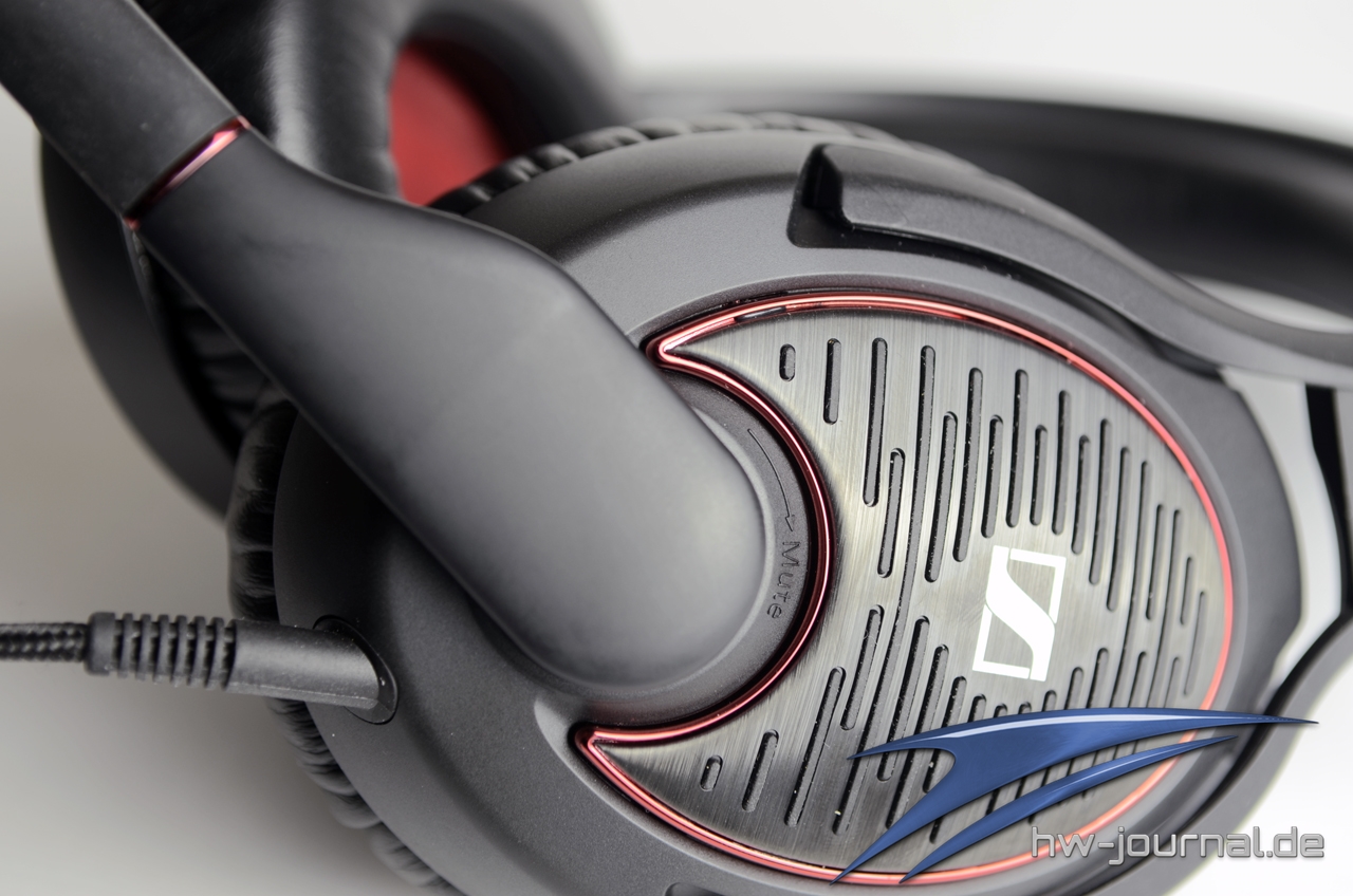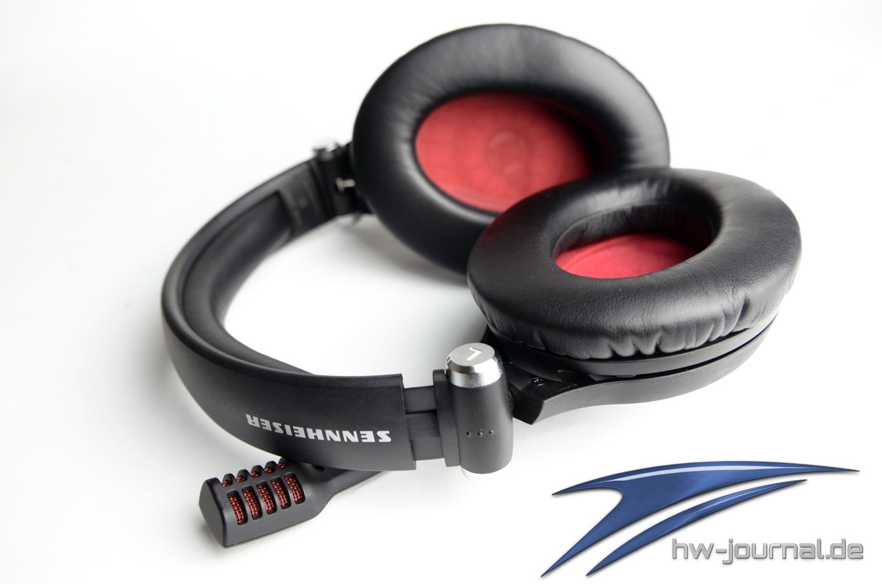 Um die Kabelfernbedienung zu umgehen, setzt Sennheiser auf die Lautstärkeregelung am rechten Hörer in Form eines runden Rädchens. Am linken Hörer befindet sich das Kabel sowie das Mikrofon, welches in der Mitte einen biegsamen Hals hat, mit dem man das Mikrofon in die entsprechend beste Position biegen kann. Unter dem Kunststoff des Mikrofonarms ist das Mikrofon zusätzlich unter einem roten Aluminiumgitter geschützt. Sehr gut finden wir die Stummschaltung des Mikrofons: Dies geschieht durch einfaches Hochschieben des Mikrofonarms und wird akkustisch durch einen kleinen Klick signalisiert. Einen Schalter, wie sonst üblich, fehlt an dieser Stelle. Das Headset ist zudem Zusammenklappbar und die Hörer um 90° drehbar.