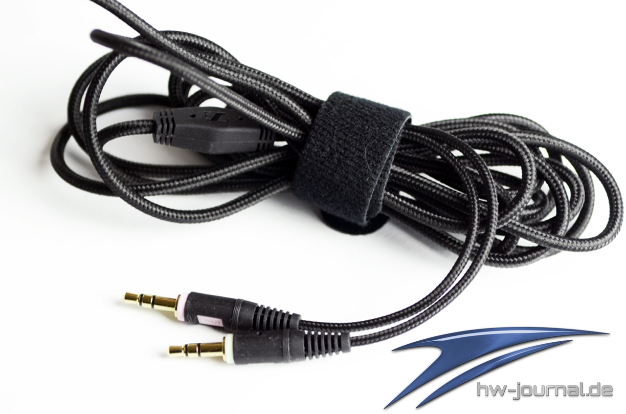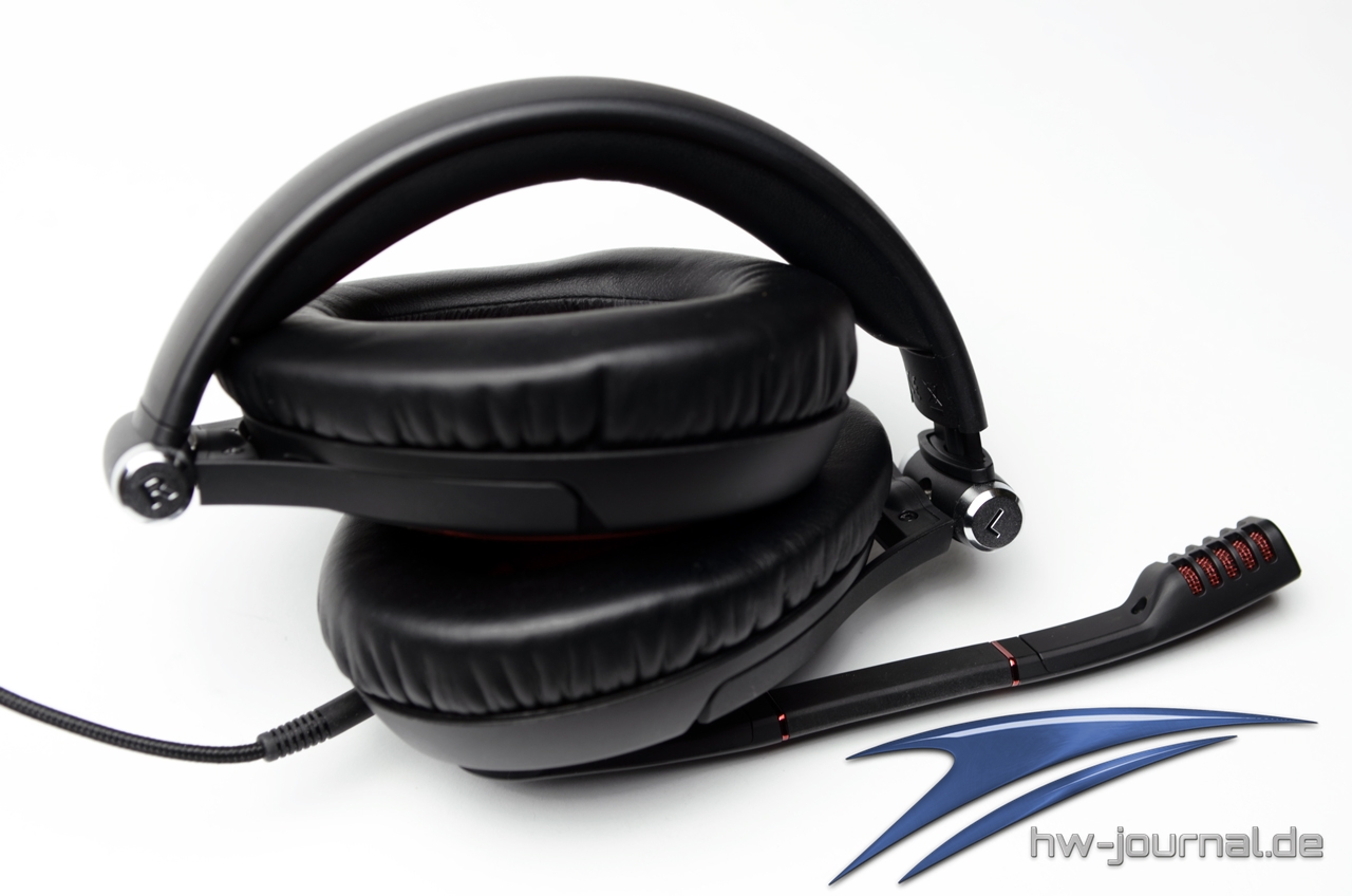 Das Headset ist fast komplett aus schwarzem Kunststoff verarbeitet worden, an den Ohrmuscheln und dem Mikrofon wurden durch ein Metallic-Rot farblich ansprechende Akzente gesetzt. Die Ohrmuscheln sind durch ein Edelstahlgelenk mit dem verstellbaren Kopfbügel verbunden und dreh- und einklappbar. Das drei Meter lange Kabel wurde ordentlich in Stoff gehüllt und bietet die Möglichkeit, dass Headset über zwei 3,5mm Klinken-Anschlüsse zu verbinden. Außerdem wurde es mit einem Klettverschluss versehen um sich den Kabelsalat beim Transport zu ersparen.