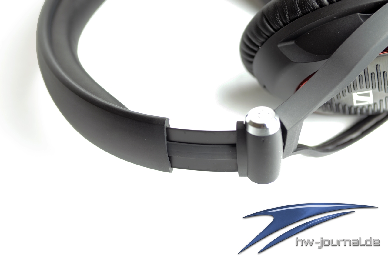 Auf der linken Seite des Kopfbügels ist ein schlicht in weiß gehaltener Sennheiser Schriftzug aufgedruckt und eine angenehm weiche Schaumstoffschicht, welche mit Kunstleder überzogen wurde. Diese sorgt für eine gute Polsterung auf dem Kopf.