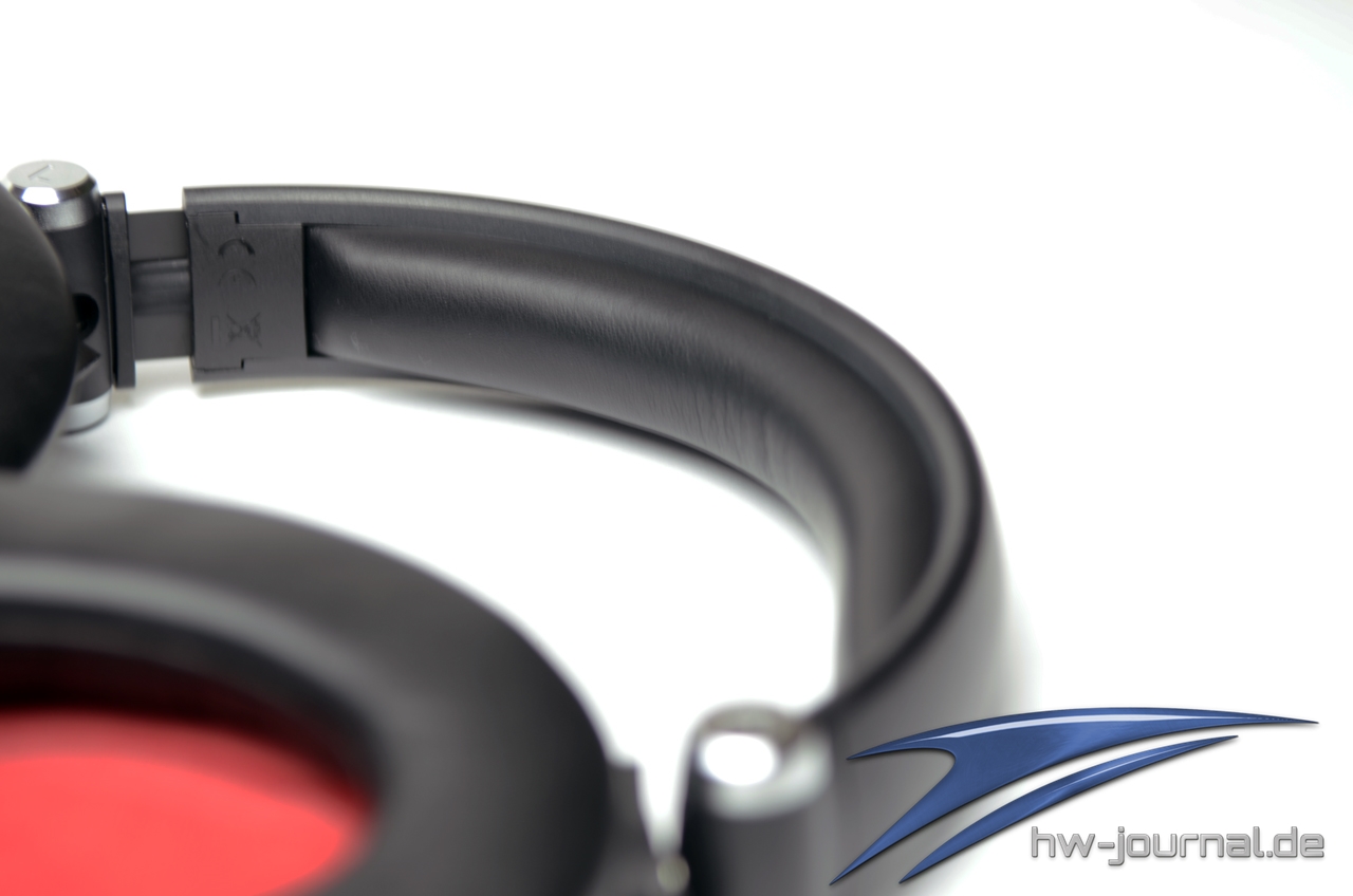 Die ebenfalls mit Kunstleder überzogenen Polster der Ohrmuscheln haben eine gute Größe für aller Art Ohren und umschließen diese nahezu perfekt. Das Innere der Ohrmuscheln ist mit rotem Stoff überzogen, welcher das Schwarz-Rote Farbthema des Headsets weiter verstärkt.