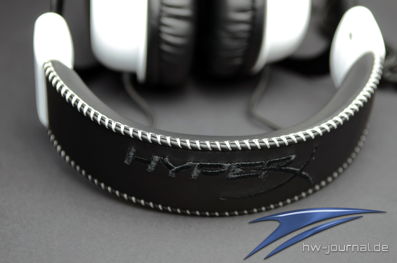 Das Kingston HyperX Cloud wurde größtenteils aus Kunststoff verarbeitet und farblich in schlichtem Schwarz-Weiß gehalten. Der verstellbare Kopfbügel ist durch dunkle Aluminiumhalterungen mit den Hörern verbunden und sorgt so für eine sehr gute Stabilität. Der Kopfbügel verfügt über eine dicke Schaumstoffpolsterung die mit Kunstleder überzogen wurde. Optisch aufgewertet wird der Kopfbügel durch weiße Nähte und dem aufgenähten HyperX Logo auf der Oberseite.