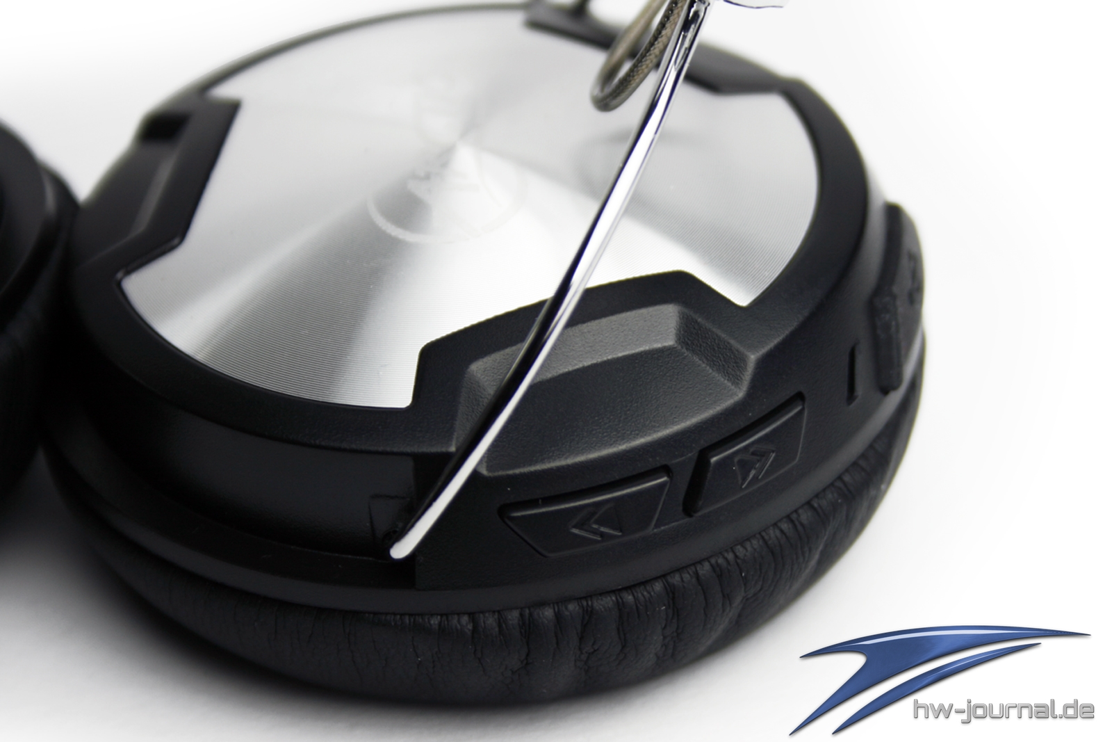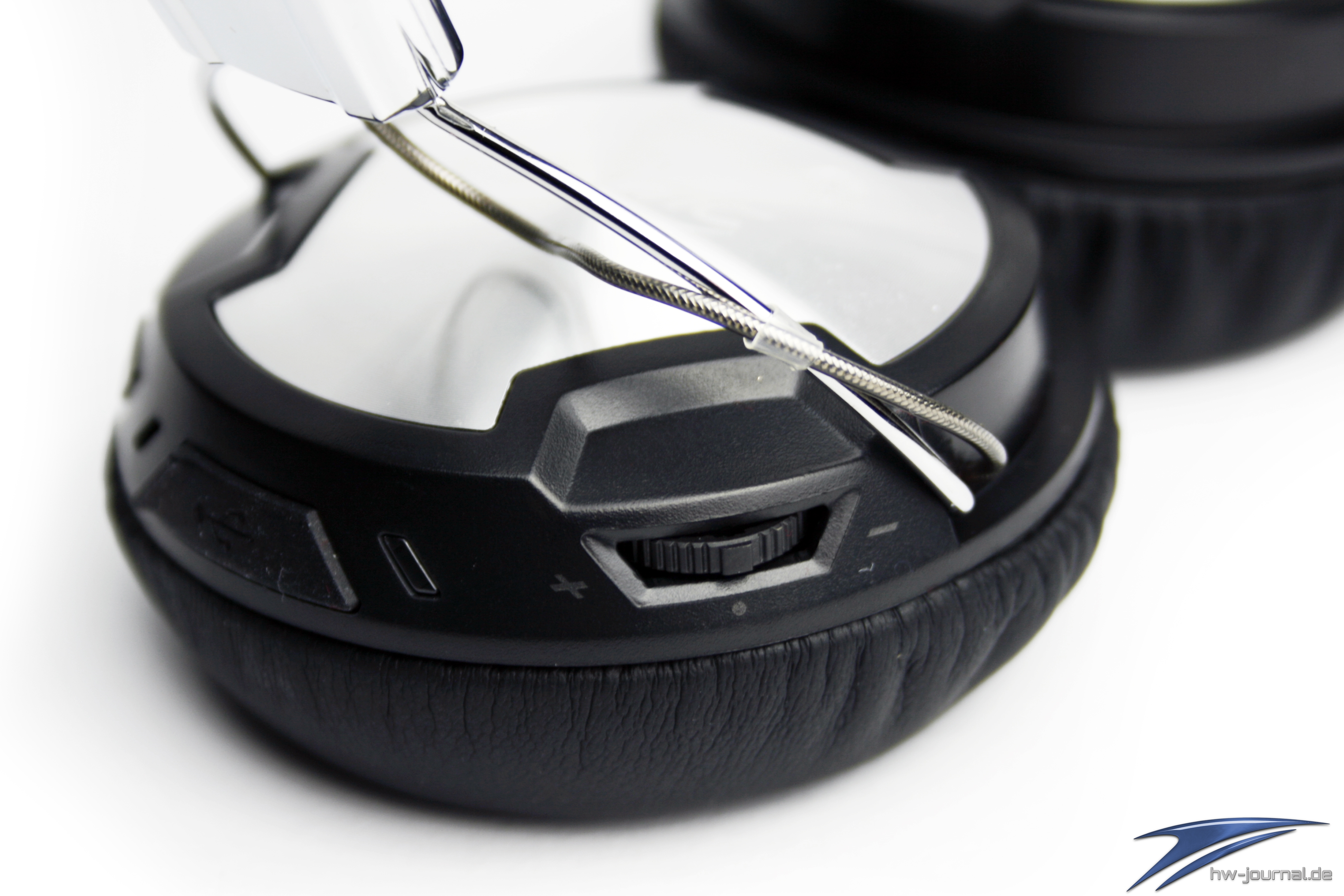 Am linken Hörer hat Arctic die Bedienelemente des Headsets verbaut, welche die Skiptasten und den Volumenregler umfassen. Durch ein Drücken des Volumenreglers, kann das Headset an- und ausgeschaltet sowie Telefonate angenommen und beendet werden. Außerdem wurde der Micro-USB-Anschluss unter einer schwarzen Gummiabdeckung verbaut, neben dem sich zudem das verbaute Mikrofon befindet.