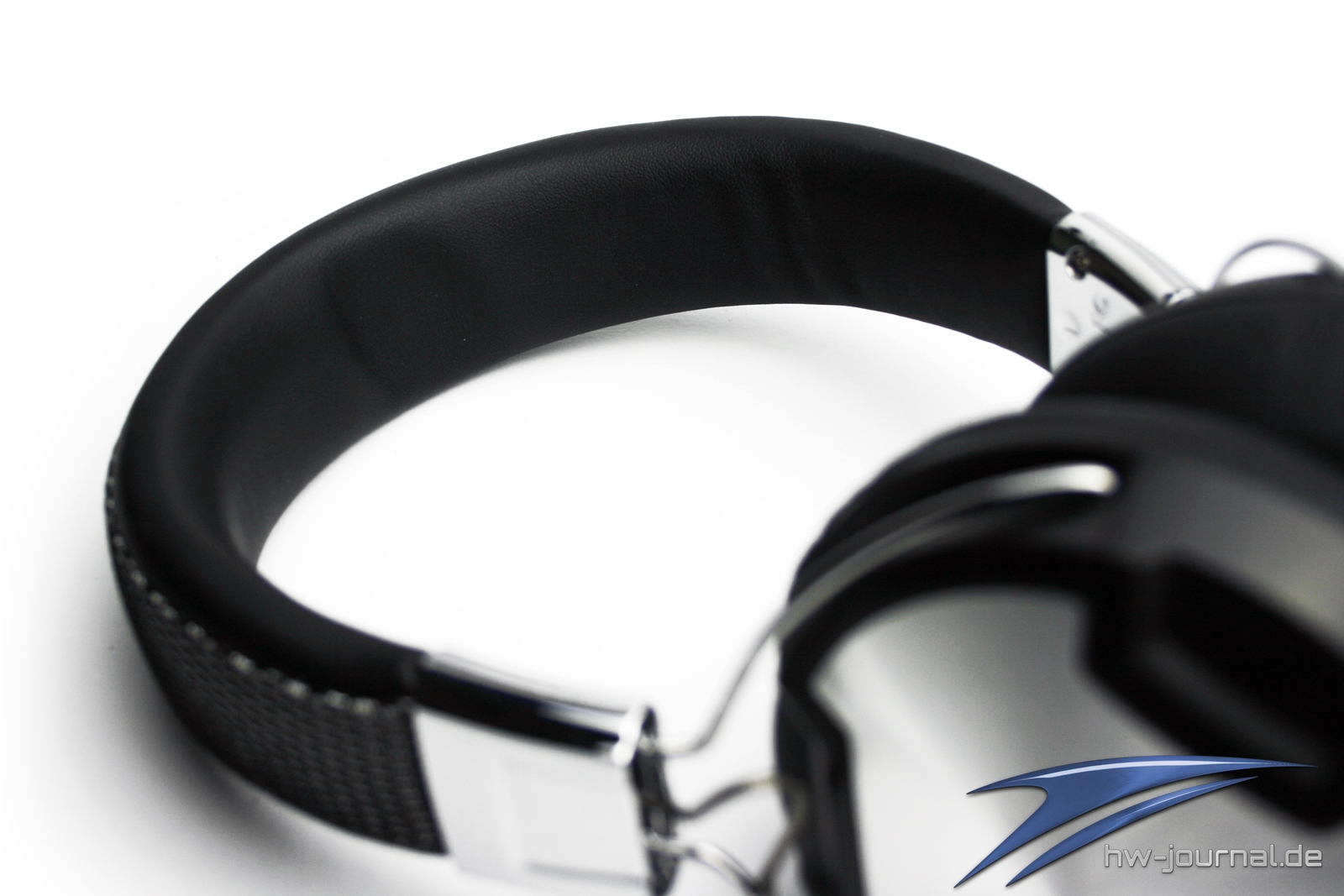 Der Kopfbügel ist, mit silbernen Stoff unter einem schwarzem Netz, an das restliche Design angepasst und rundet das stylische Produktbild perfekt ab. Die Polsterung am Kopfbügel versteckt sich unter Kunstleder und ist leider von geringerer Dicke. Die perforierte Hörerpolsterung bietet dem Nutzer etwas mehr Komfort. Das P614BT sitzt dennoch bequem auf dem Kopf, erzeugt nach längerer Nutzung aber ein Druckgefühl an den Ohren. Da es sich hier um ein On-Ear-Headset handelt, war davon jeoch schon im Vorfeld von auszugehen.