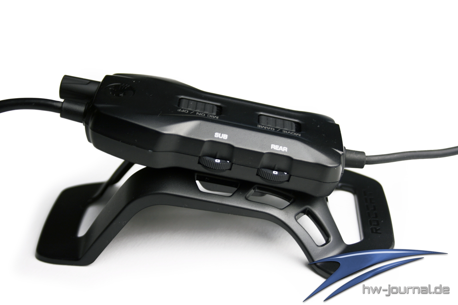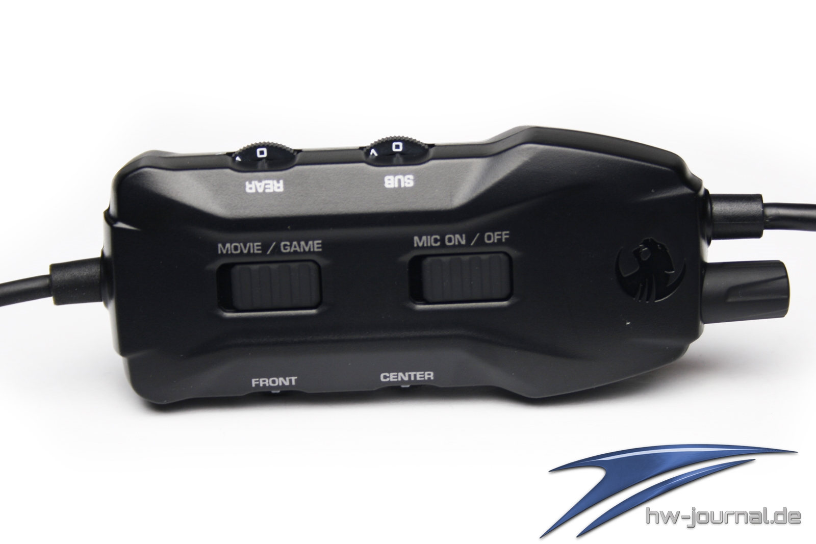 Die an ein Funkgerät erinnernde Steuereinheit, kann mit einem Clip an der Kleidung befestigt oder auf die mitgelieferte Halterung geklemmt werden, um auch vom Tisch aus eine leichte Bedienung zu gewährleisten. Einstellen kann der Nutzer hier den Sub, Rear, Front und den Center. Außerdem wird über den, optisch wie eine Antenne wirkenden, Regler die Lautstärke reguliert und Zwei Schalter bieten die Möglichkeit das Mikrofon stummzuschalten sowie den Sound-Modus für Games oder Filme umzustellen.