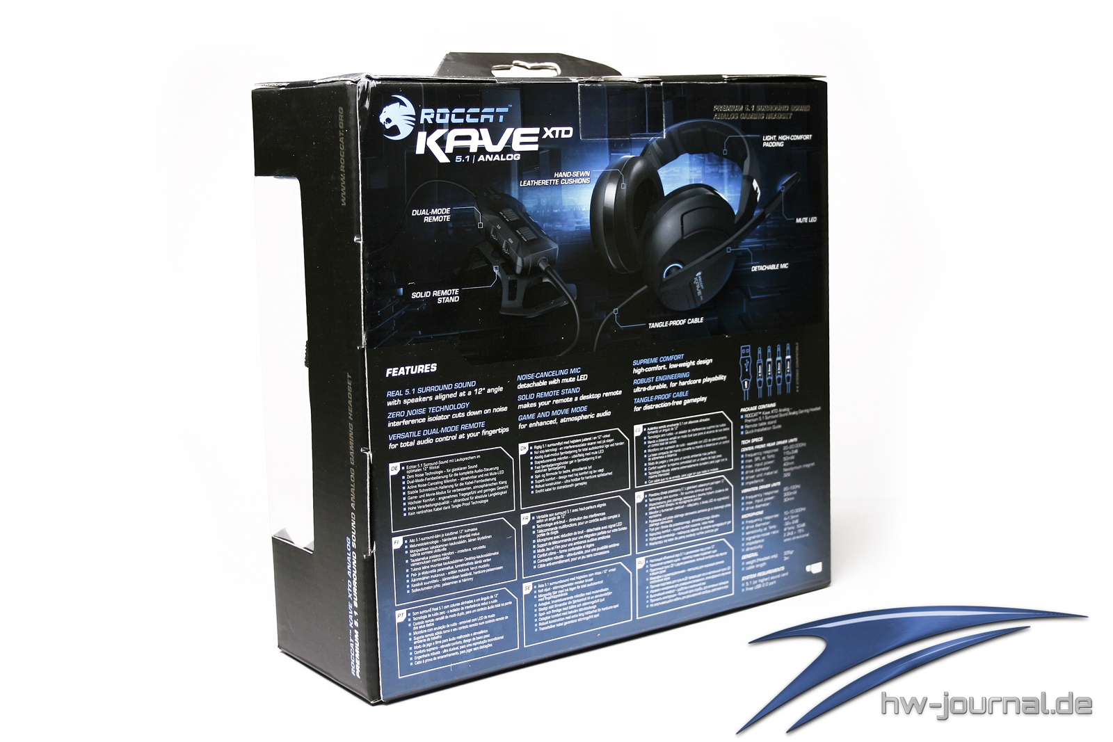 Das Roccat Kave XTD 5.1 analog wird in einem Schwarz-Blauen Karton ausgeliefert, der durch ein Sichtfenster an der Front einen Blick auf das Headset und die Fernbedienung erlaubt, die Rückseite informiert über den Funktionsumfang.