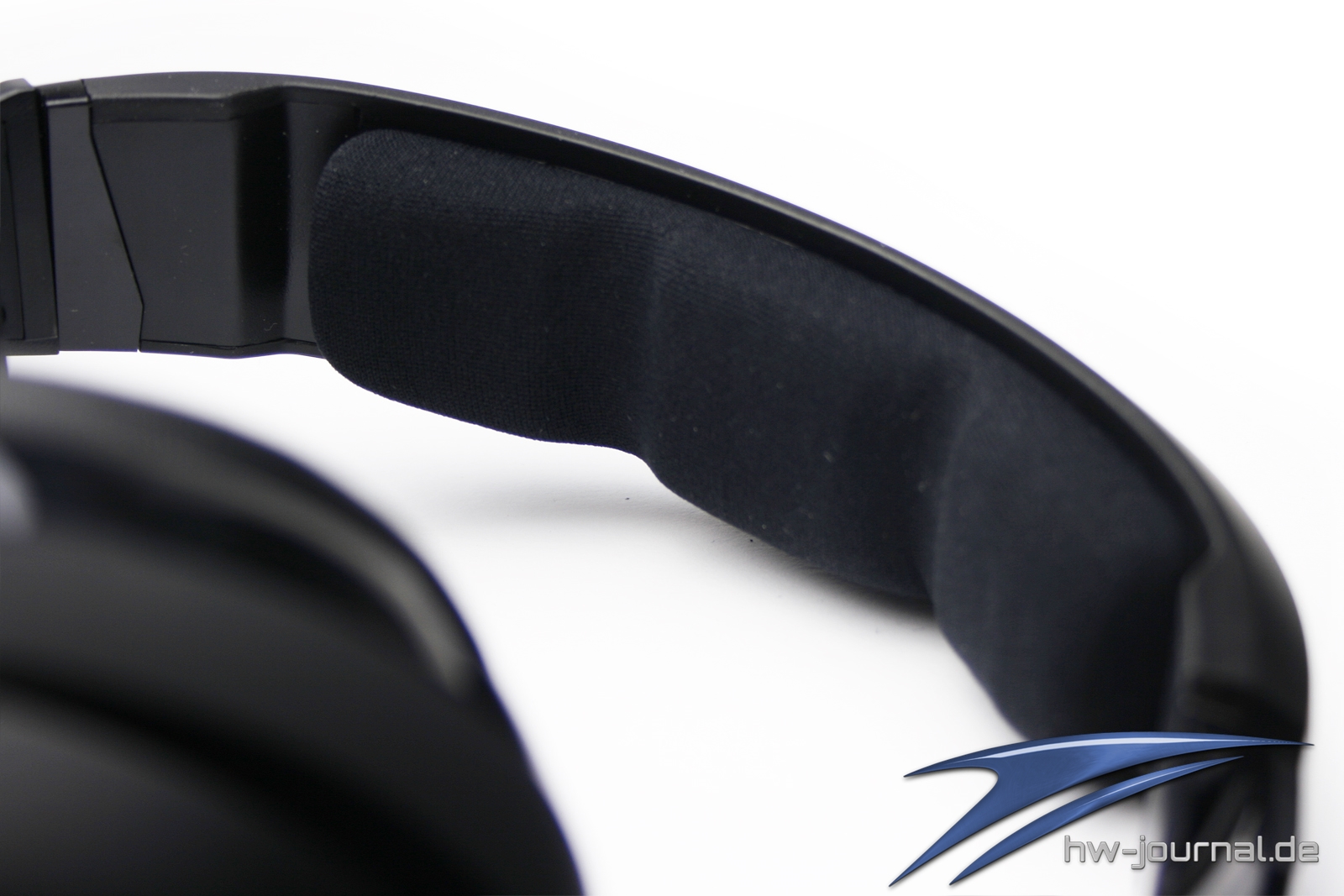 Der verstellbare Kopfbügel verfügt auf beiden Seiten über eine kleine Einkerbung, die die eingestellte Größe in Zahlen anzeigt, so wird eine gleichmäßige Einstellung beider Seiten gewährleistet. Die Oberseite des Bügels wurde mit einem gestanzten Roccat-Schriftzug versehen.