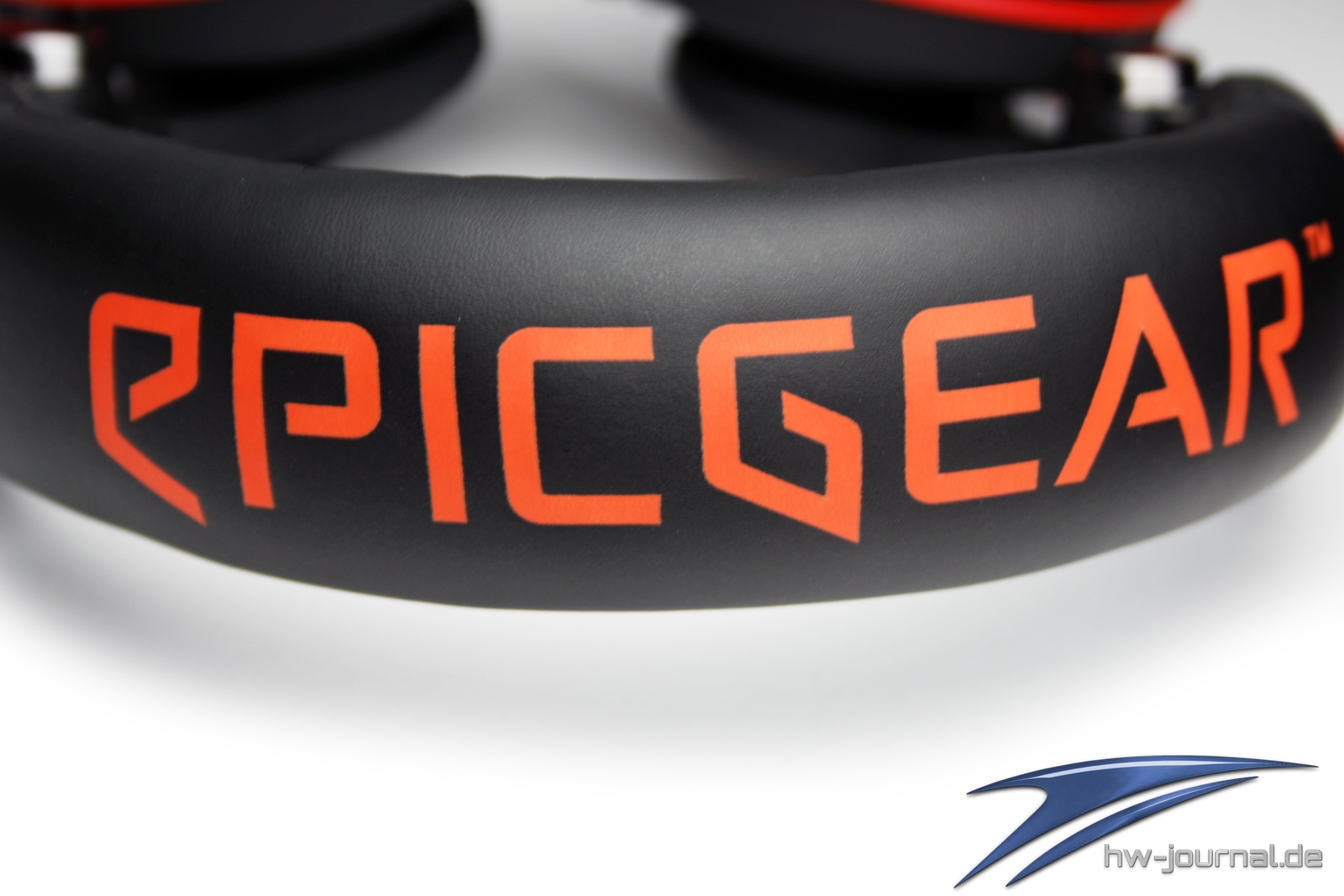 Die kontrastreiche Farbgebung zieht sich auch beim Headset weiter durch das Design und setzt nette Akzente für das Gamer-Auge. Gefertigt wurde das Sonorouz SE zwar komplett aus Kunststoff, besticht aber durch eine gute Verarbeitungsqualität und stabile Bauweise. Die ohrumschließenden Hörer werden durch große Schwarze Schaumstoffpolster im Kunstledermantel überzogen und bieten, zusammen mit dem ebenso gut gepolsterten Kopfbügel, einen angenehmen Tragekomfort. Der Kopfbügel lässt sich einfach verstellen und bleibt dank mehrerer Einraststufen an der gewünschten Position. Die Oberseite wird zudem durch einen aufgedruckten Orangen EpicGear Schriftzug aufgehübscht.