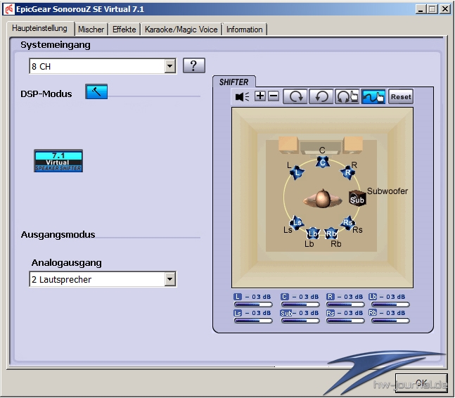 Um alle Funktionsmöglichkeiten und vor allem auch den 7.1 Surround-Sound genießen zu können, ist der Nutzer gezwungen die vom Hersteller zum Download bereitgestellte Software zu installieren. Dank dieses Steuertools, kann der Klang ganz simpel an die jeweiligen Bedürfnisse angepasst werden. Unter anderem kann zwischen Stereo und 7.1 Sound umgestellt und die Kanäle einzeln angefasst werden. Neben Reglern für Volumen und Mikrofonlautstärke, bietet EpicGear einen Equalizer mit diversen voreingestellten Setups und die Möglichkeit die Raumgröße sowie die Umgebungswahrnehmung digital zu verändern. Wer auf Spielerein steht, kann seine Stimme mit Effekten versehen.