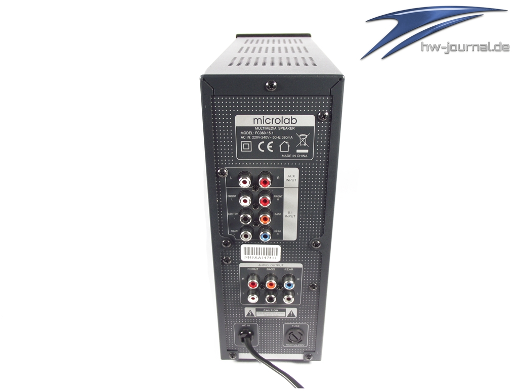 - Eingänge: PC (3x Doppelcinch für 5.1), AUX (1x Doppelcinch für 2.1)