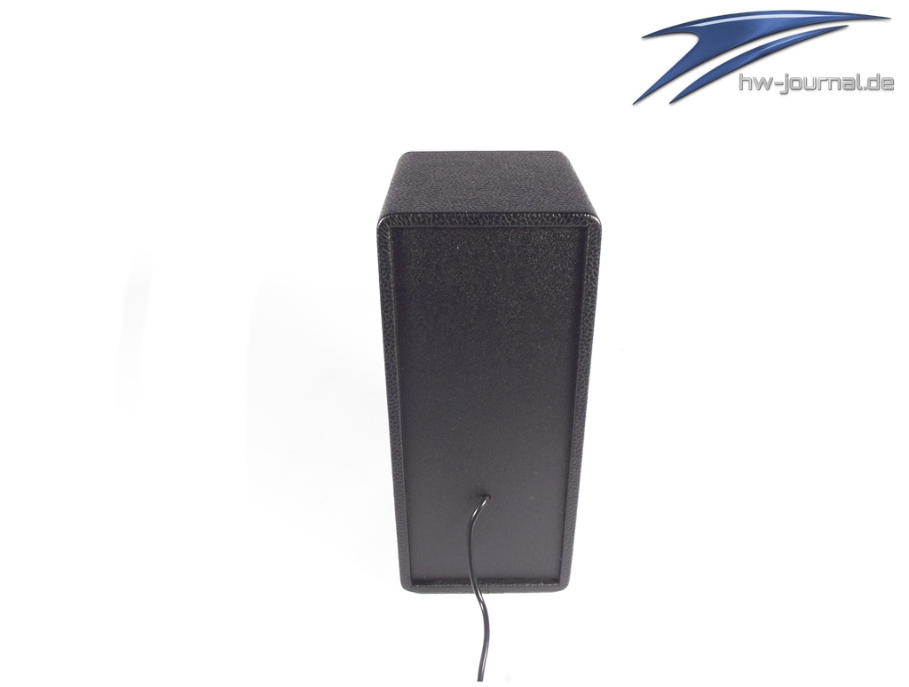 Der Subwoofer ist ebenfalls gut verarbeitet. Auch hier sieht man an der Rückseite das fest installierte Cinch-Kabel. Darüber hinaus befindet sich an der rechten Seite der Bassreflexkanal mit ~70mm Durchmesser.