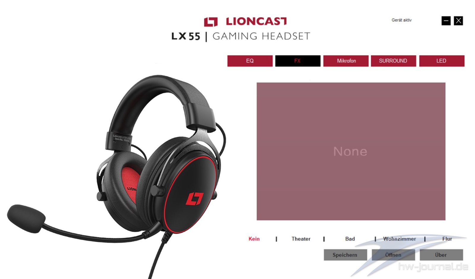 Die Software ist identisch wie beim Lioncast LX30 aufgebaut, was den Verdacht, dass die gleiche Soundkarte eingesetzt wird, etwas verstärkt. Interessanterweise wird das LX55 USB am PC als LX50 USB erkannt. Vielleicht hatte man Anfangs noch nicht ganz festgelegt, unter welcher Bezeichnung die Variante erscheinen soll. Den Anfang macht in der Software der Equalizer, welcher allerdings nur geringe, wenn auch hörbare Veränderungen hervorruft.