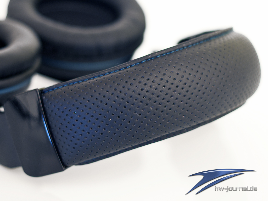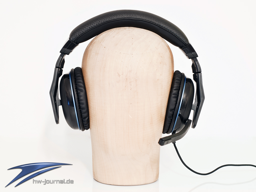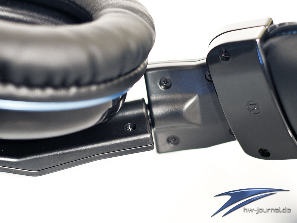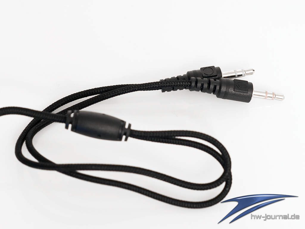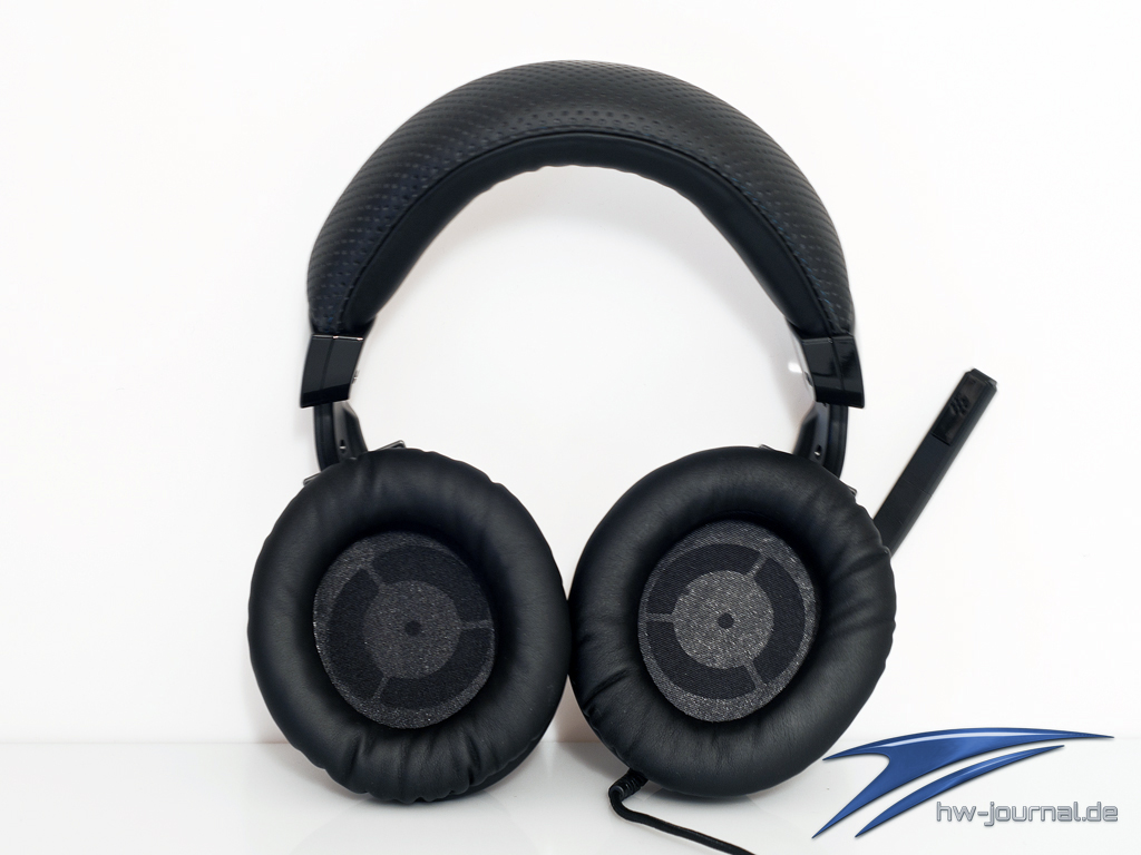 Die 11cm großen Ohrmuscheln sind sehr gut mit Schaumstoff gepolstert und umschließen auch große Ohren vollständig. Diese lassen sich um 90° drehen und passen sich somit perfekt der Kopfform an. Leider lassen sich die Polster nicht tauschen wie beim Steelseries 7H Headset, was aber auch in einer Preisregion liegt. Der Bügel ist auch mit Schaumstoff gepolstert und fühlt sich angenehm an. Die Membrane sind mit einer dünnen Stoffschicht geschützt. Das rechts unten angebrachte Lautsprecherkabel ist mit 3m ausreichend dimensioniert und ist mit einer Kabelfernbedienung ausgestattet. Das Mikrofon lässt sich durch eine leichtgängige Einrastfunktion gut in die gewünschte Position bringen und besitzt einen Schwenkradius von circa 180°.