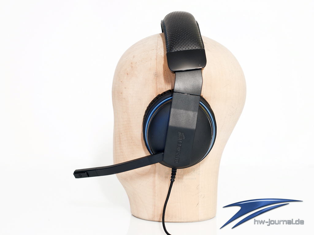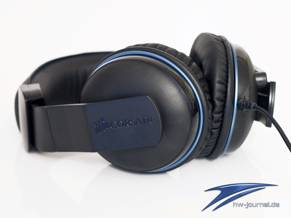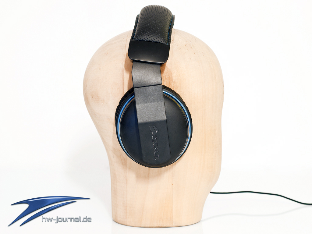 Das Corsair Vengeance 1300 Headset kommt in einem schwarzem Kunststoff Outfit daher, was mit blauen Akzenten rund um die Ohrmuschel verziert ist. Auf den beiden Ohrmuscheln ist dezent das Corsair Logo eingebettet. Die Verarbeitung macht einen guten Eindruck und das Headset wirkt hochwertig.