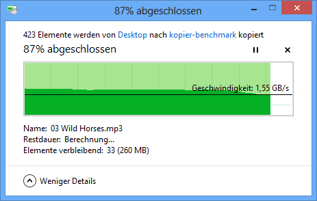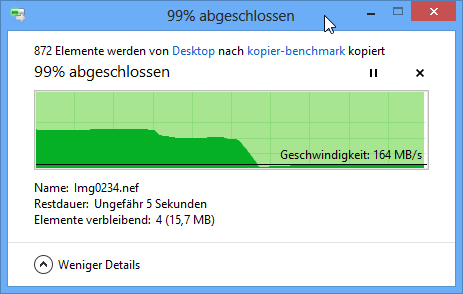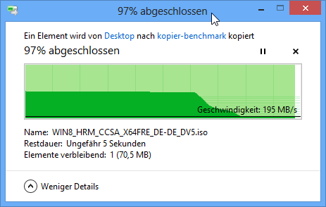 Methode 1 unseres Kopier-Benchmarks wurde so durchgeführt, dass jedes Dateimuster mit 10 Durchläufen hintereinander dran war, bevor der Kopiervorgang mit dem nächsten Dateimuster startete. Bei allen Laufwerken unterstützt das Caching von Windows 8 den Kopiervorgang so stark, dass wir keine subjektive Messung der reinen Datenträgerleistung durchführen konnten. Die Statusanzeige der Kopiervorgänge ab Durchlauf 2 stellten sich durchweg wie folgt dar, was die Vergleichbarkeit schwierig macht.