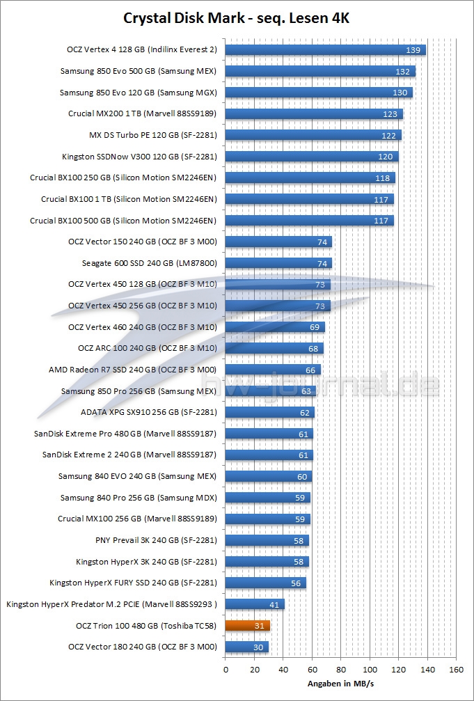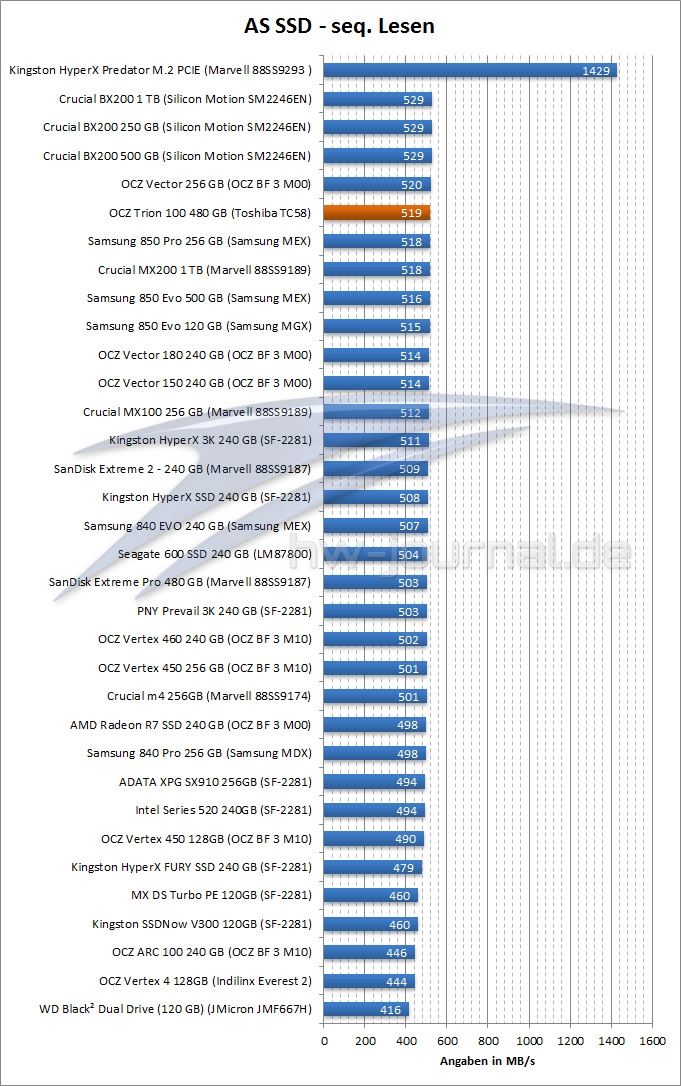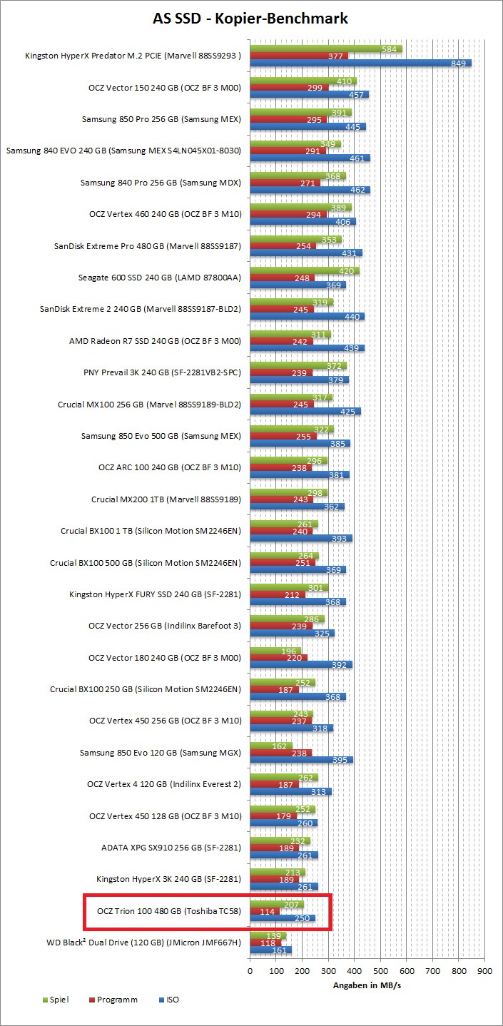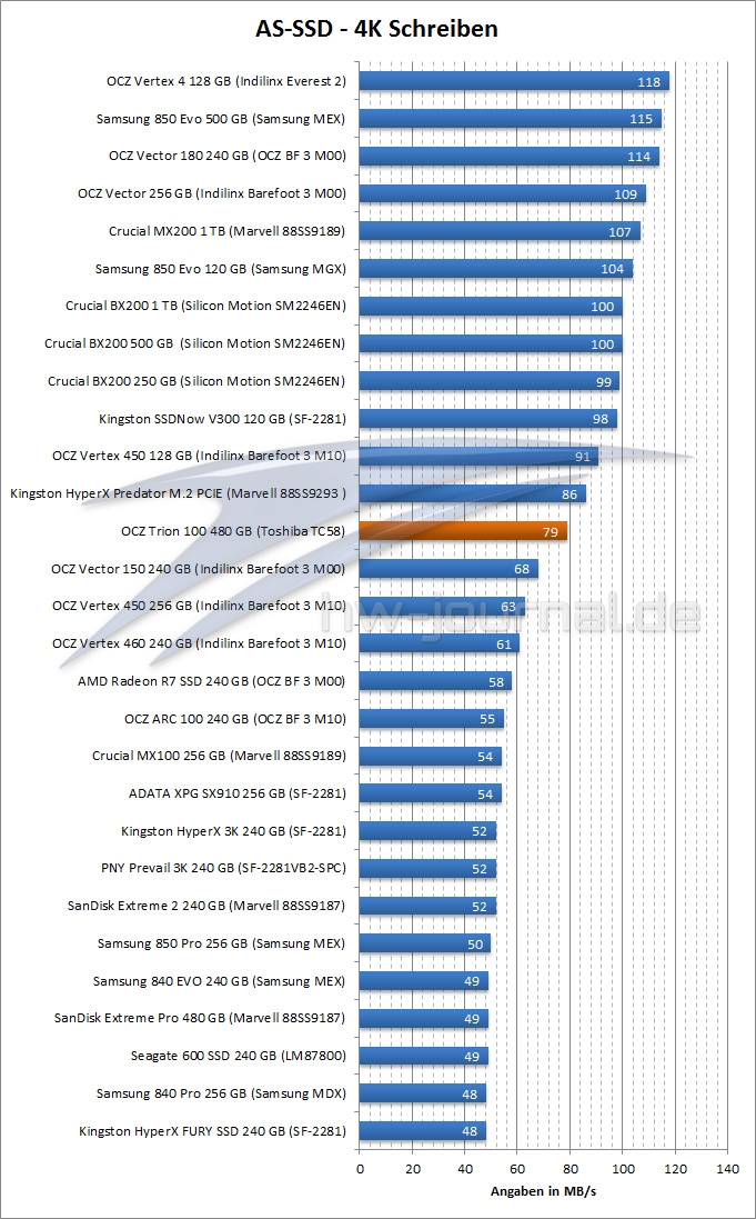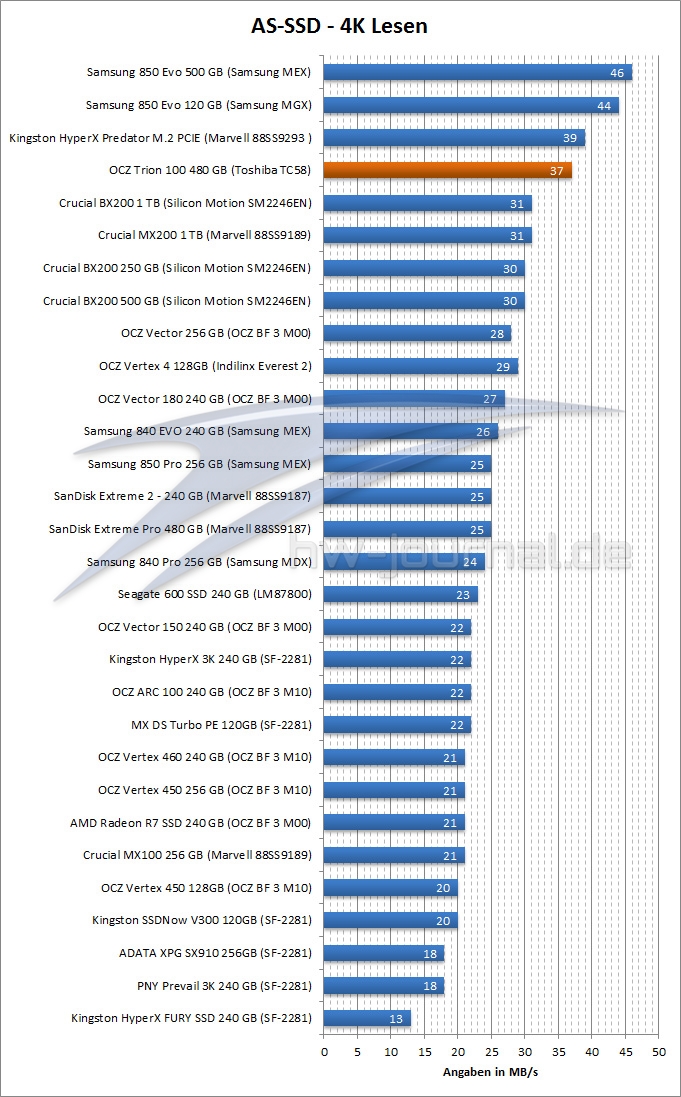 Bezeichnung | OCZ Trion 100 | Crucial BX100 | Samsung 850 EVO | OCZ Vector 180 | SanDisk Extreme Pro | Samsung 850 Pro |
