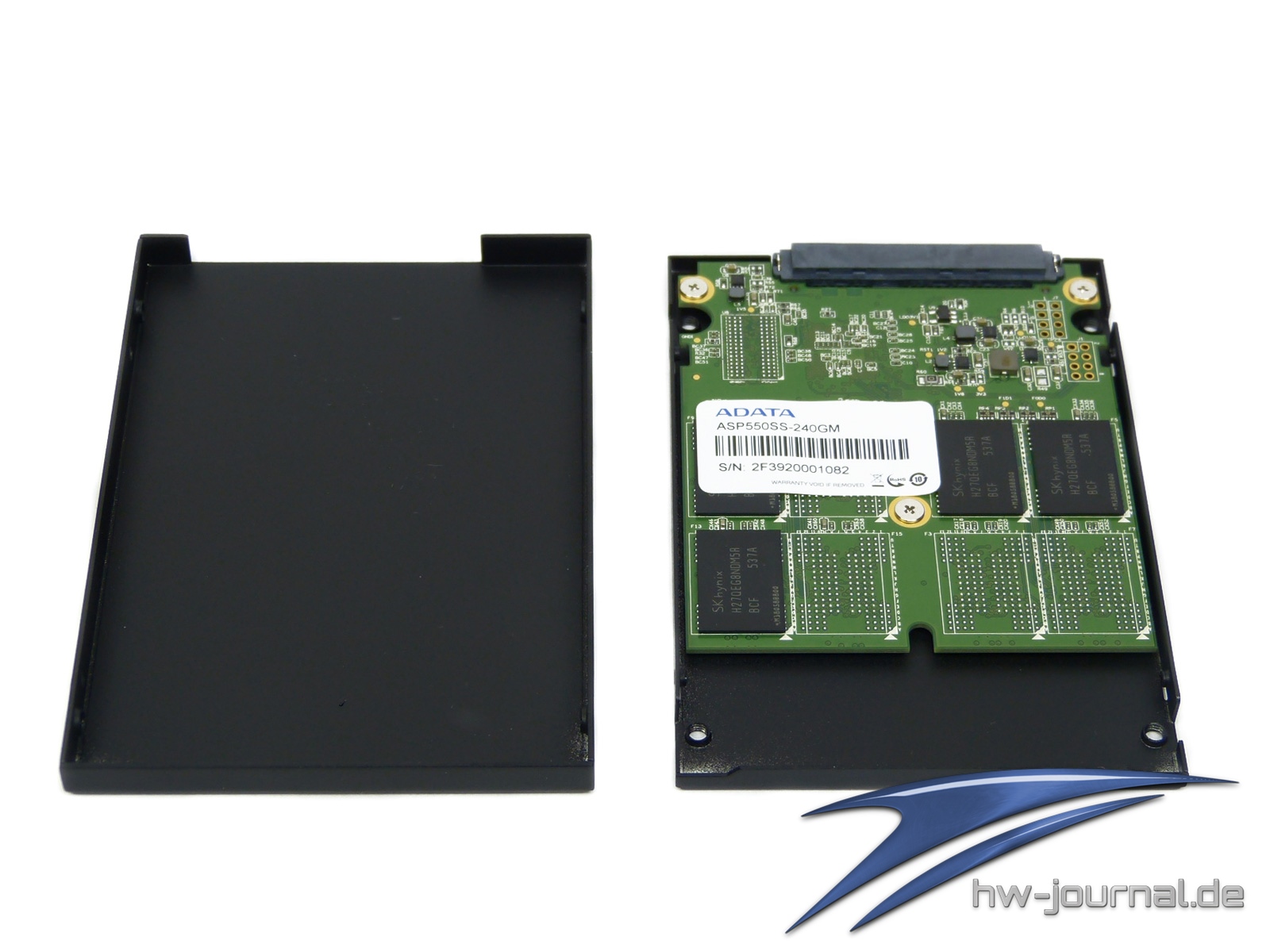 Wie in der jüngeren Vergangenheit schon öfter bei der Konkurrenz gesehen, verwendet auch ADATA ein leichtes Aluminium-Chassis für das PCB. Vier Schrauben halten das Gehäuse nochmals fest zusammen. Beim Gewicht bringt die SP550 circa 51 Gramm auf die Waage.