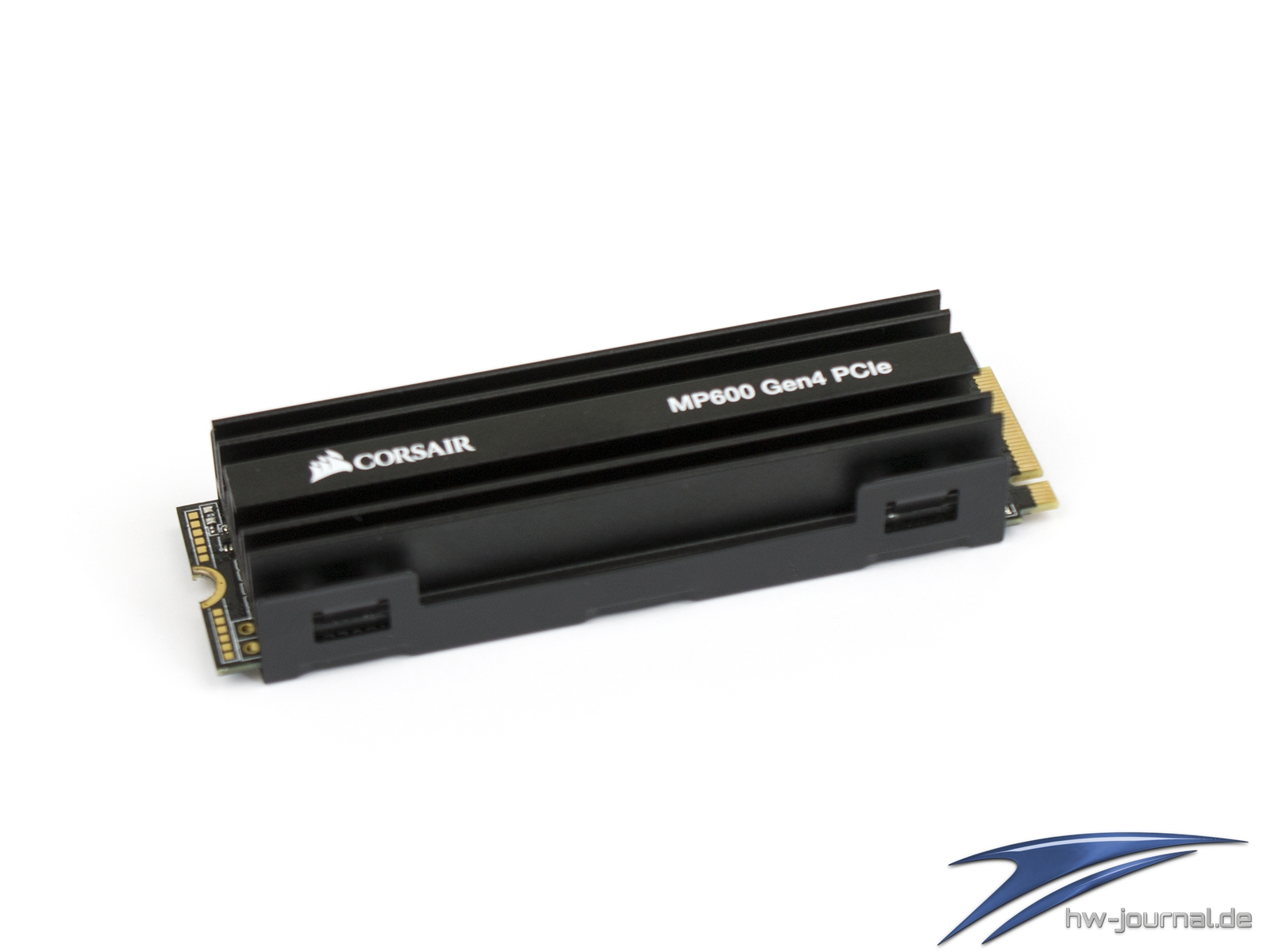 Wie man auf der Computex 2019 bereits sehen konnte, sind beinahe alle oder sogar besser gesagt alle PCIe 4.0 NVMe SSDs mit einem Kühler versehen. Das ist auch bei der Corsair Force MP600 der Fall. Der Hersteller versieht die SSD im 2280 Format (22mm breit und 80mm lang) mit einem Konstrukt aus Aluminium. Im Profil sieht man, dass sieben Finnen die Abwärme aufnehmen bzw. abgeben sollen.