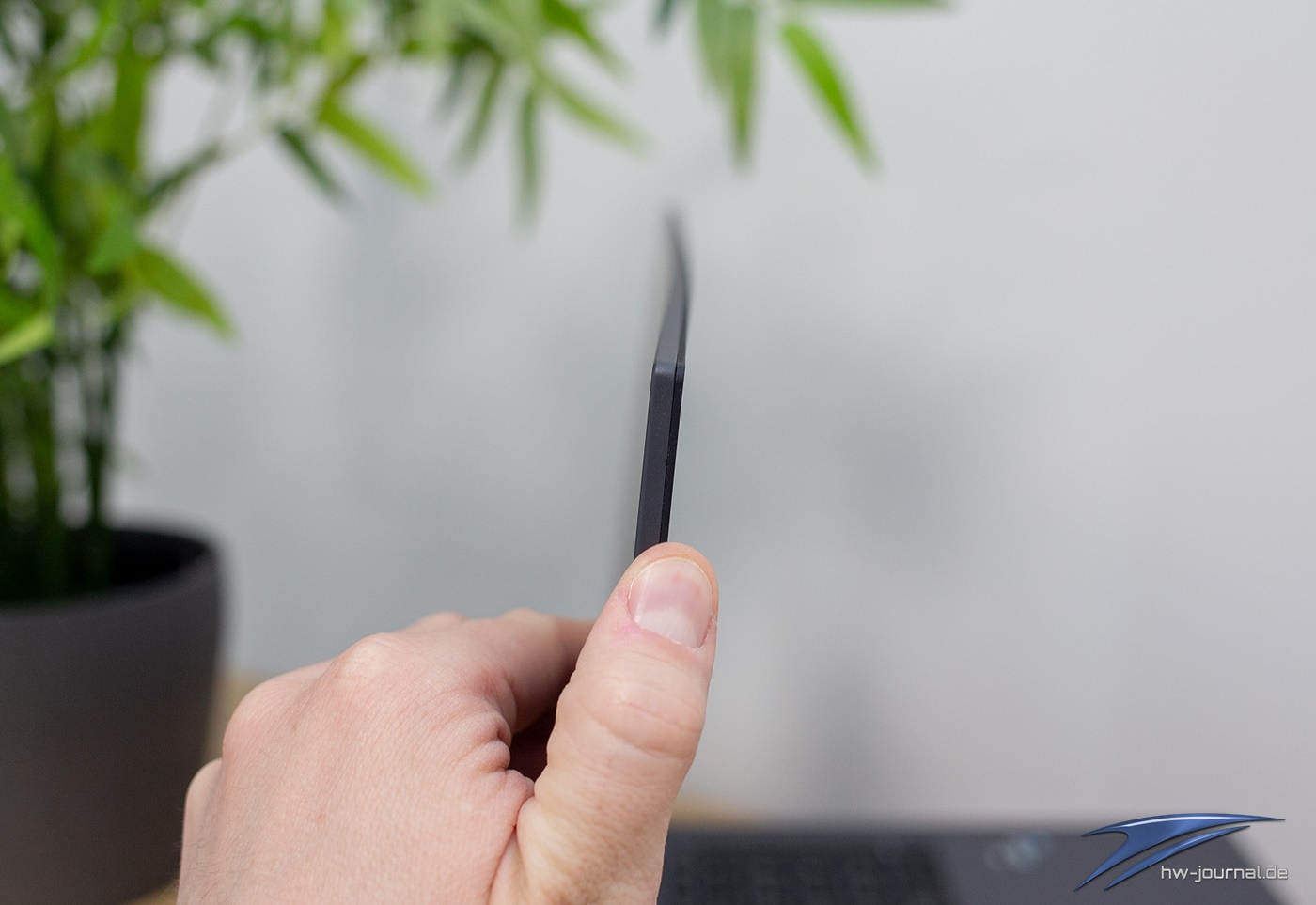 Bleiben wir mal beim direkt beim Gehäuse, vielen dürften sicher noch an das „Bendgate“ von Apple im Hinterkopf sitzen. LG verfolgt seit der Neuauflage der gram Notebook Serie den Ansatz, dass das Display im gewissen Maße biegsam sein soll. Denn man kennt es, das Notebook wird in einer Tasche oder Rucksack transportiert und dann passiert es schnell, dass das Display einen Schaden bekommt. Wie abgebildet, hat die Rahmenkonstruktion als auch das Panel selbst ein gewisses Maß an Flexibilität spendiert bekommen, frei nach dem Motto: „let in bend but dont break“. In der Praxis erweist sich das als angenehm und ohne Auswirkungen auf das Sichterlebnis. Der Hersteller hat uns diesen Standpunkt auch nochmal klar vermittelt, dass dies explicit so gewollt ist.