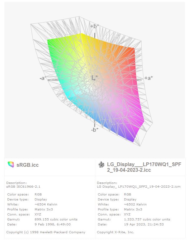 Mithilfe eines X-Rite i1Display Pro Kolorimeter wurde auch die Farbraumdeckung des sRGB Farbraums überprüft. Dieser bietet für eine gute Grundlage, um auch der Bildbearbeitung unterwegs nachzukommen.