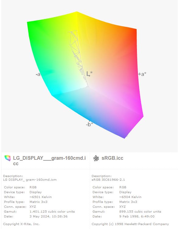 Mithilfe eines X-Rite i1Display Pro Kolorimeter wurde auch die Farbraumdeckung des sRGB Farbraums überprüft. Dieser bietet für eine gute Grundlage, um auch der Bildbearbeitung unterwegs nachzukommen.