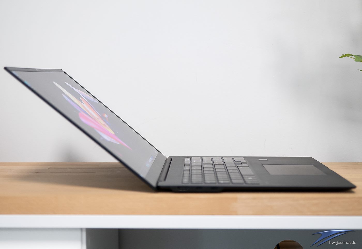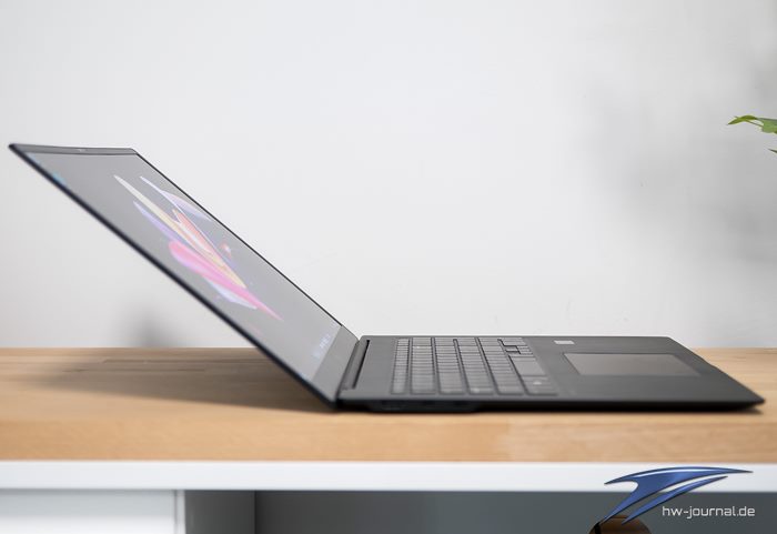 Die Akkulaufzeit überzeugte mit einer ausdauernden Performance. Der fest verbaute 77 Wattstunden Akku bietet in Verbindung mit der effizienten Hardware Laufzeit satt und hält bequem einen normalen Office-Tag ohne Stromanschluss durch. Ob nun Texte schreiben in Word, in Outlook E-Mails beantworten, hier und da ein paar Bilder in Photoshop aus Pressemitteilungen zurechtrücken, bei halber Helligkeit des Displays lief das Notebook locker 14-15 Stunden durch. Die Displayhelligkeit hatten wir dabei auf rund 160 cd/m² eingestellt, was im Windows-Setting den Regler bei 58 von 100% bedeutet.