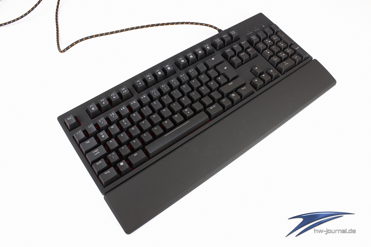 Insgesamt besteht die Tastatur aus zwei verschiedenen Kunststoffvarianten, einerseits eine raue, harte aber dafür stabile Unterseite und andererseits eine angenehm weiche, "Soft"-Oberfläche auf der oberen Seite. Man kennt diesen matten Kunststoff schon von Bitfenix unter dem Namen "SoftTouch", der mittlerweile immer häufiger bei Gamer-Gear zum Einsatz kommt. Farblich ist die KB-460 in einem tiefdunklen Mattschwarz gehalten, das sich perfekt an die rote Beleuchtung und die darunter liegende rote Fläche anpasst. Auch die beiliegende Handballenablage strahlt im selben Mattschwarz, extra beschichtet mit einer leichten Gummierung zum besseren Halt der Hand, so wie die etwas ähnliche Trigger Z von Cooler Master.