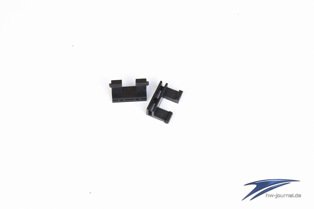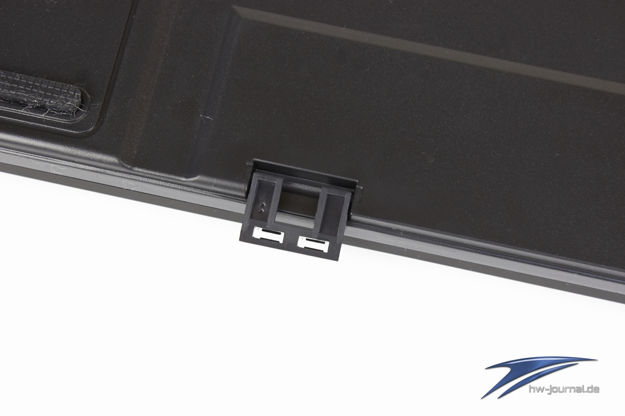 Wie schon erwähnt bietet das Keyboard eine extra montierbare Handballenablage, die durch zwei kleine Clips befestigt wird. Diese Clips werden einerseits an der Tastatur durch jeweils zwei kleine Pins verankert, während die Ablage auf der anderen Seite einfach aufgesteckt wird und festsitzt. Sie rakt etwa fünf bis sechs Zentimeter zusätzlich vorne hinaus und bietet dem Handballen eine angenehme Auflagefläche.