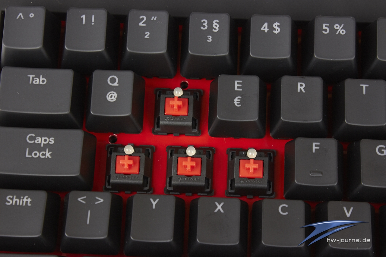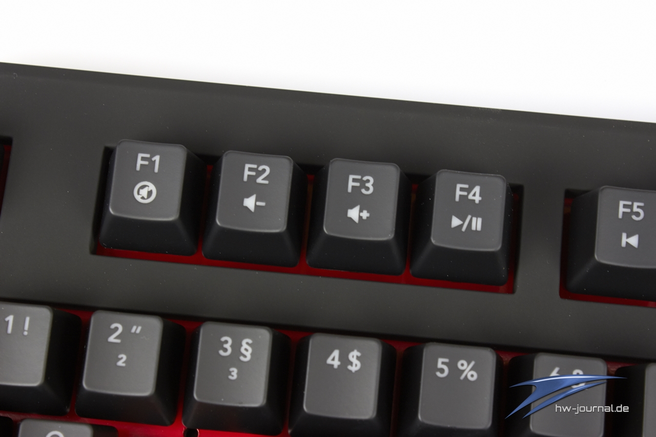 Erstmal ist der technische Aufbau wichtig, denn ohne ihn ist eine gute Qualität und eine lange Lebensdauer nicht zu gewährleisten. Dazu tragen auch die Red Switches von Cherry bei, wordurch ein leichter Druckpunkt und somit eine schnelles Feedback am PC ermöglicht wird. Schnellem Schreiben auf der KB-460 steht demnach nichts im Wege. Das erste große Feature, die rote Hintergrundbeleuchtung, funktioniert tadellos und ist auch bei Tageslicht hell zu erkennen. Falls es einem im Dunkeln zu hell werden sollte, kann man die Helligkeit um bis zu zwei Stufen reduzieren. Ermöglicht wird dies durch eine FN-Taste, die den Platz der rechten Windows-Taste einnimmt und dadurch zusätzliche Funktionen erlaubt. Die Medien- und Zusatztasten sind bei den F-Tasten und dem Numpad untergebracht, daneben gibt es noch die sogenannte fUnc-Taste, die sich auf der F12-Taste versteckt hält. Sie ermöglicht bei Aktivierung unter Anderem das Abschalten der Windows-Taste und somit das ungewollte "raustabben" beim Spielen. Sehr praktisch!