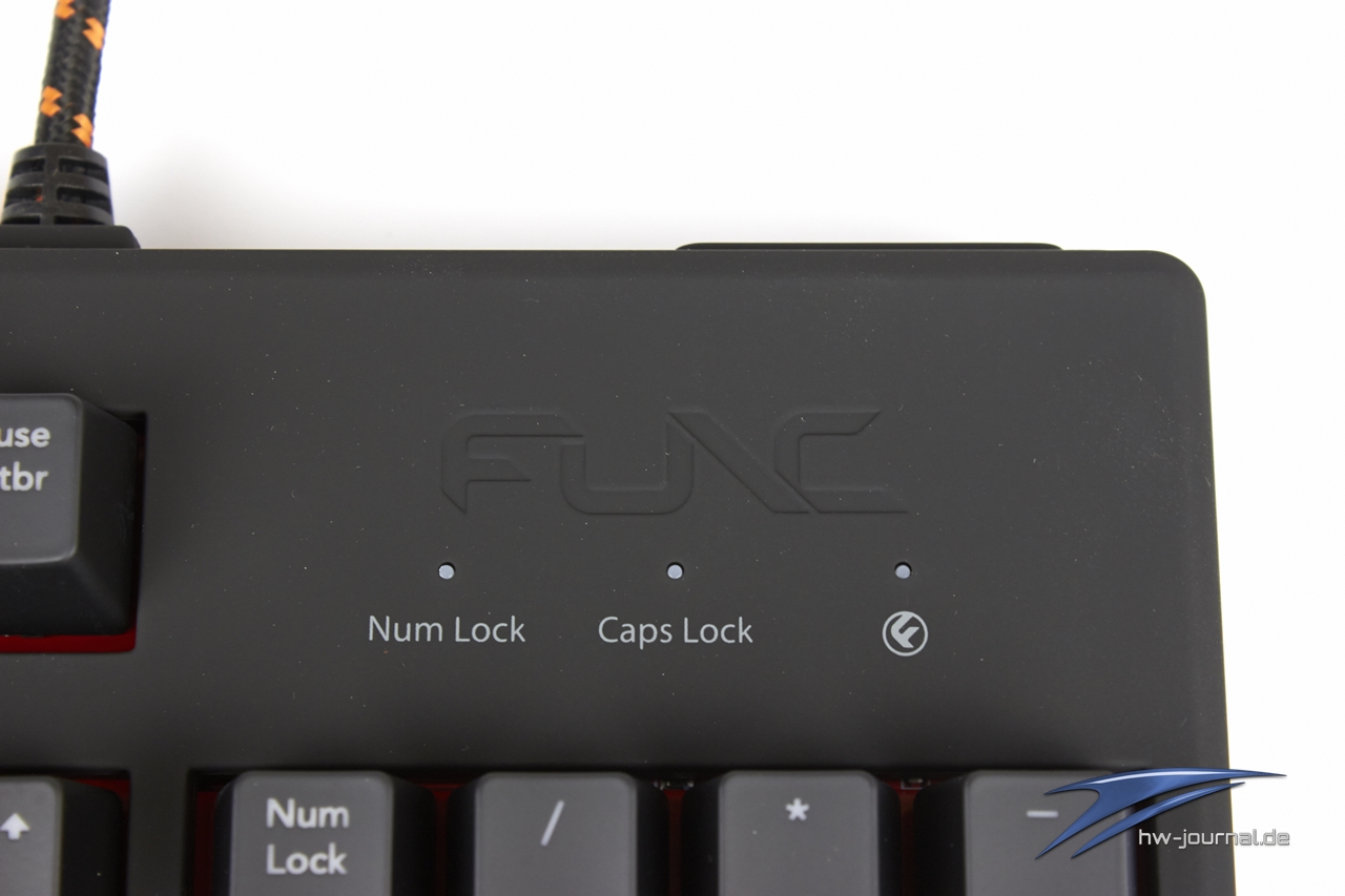 Tastentechnisch verbaut fUnc die MX Red Switches vom deutschen Hersteller Cherry. Sie zeichnen sich vor allem durch einen leichten Druckpunkt und eine schnelle Übertragung an den PC aus - perfekt zum Spielen und schnellen Tippen, doch auch dazu mehr im Praxistest. Mit integriert in die Switches ist eine leuchtstarke LED, die die rausgelaserten Buchstaben und Zeichen der Keycaps hell erstrahlt. Mit mehr als 100 Tasten bietet die KB-460 so Einiges, vor allem durch die zusätzliche FN-Taste erspart man sich weitere Extratasten wie beispielsweise die Macro-Tasten am linken Rand der MEKA G-Unit von Thermaltake. Die Lautstärkeregelung, die Einstellung der Beleuchtung aber auch fünf programmierbare Extratasten lassen sich mit der FN-Taste betätigen. Die fUnc-Taste, die beispielsweise die Windows-Taste "lockt" und so das "raustabben" beim Spielen verhindert, wird ebenfalls mit der FN-Taste aktiviert. Im rechten oberen Eck befinden sich drei kleine Status-LEDs für das "NumLock", das "CapsLock" und die fUnc-Taste. Direkt darüber zeigt sich ein eingebetteter Schriftzug von Func, der sich nur gegen das Licht gehalten sehen lässt. Was im Vergleich zu manch andere Tastatur wie beispielsweise der Shine 3 von Ducky Channel auffällt, ist das Fehlen einer zweiten Windows-Taste, die aufgrund der FN-Taste und des kompakten Baus ihren Platz einziehen musste.