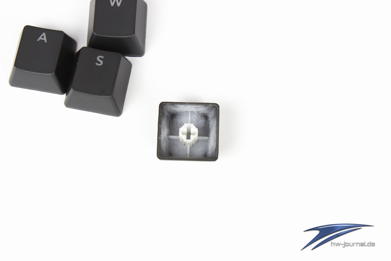 Ein weiteres nettes Gimmick findet sich bei der LED-Beleuchtung, die neben drei Helligkeitsstufen auch einen "Pulsing"-Effekt besitzt. Einstellen kann man ihn durch ein erneutes Erhöhen der Helligkeit im Numpad mit >FN + 8 / Pfeil nach oben<. Um den Effekt wieder abzuschalten, einfach mit >FN + 2 / Pfeil runter< wieder eine Helligkeitsstufe zurückschalten. Zwar ist dieser Effekt schön anzusehen, beim Schreiben oder Zocken ist dieser Modus jedoch eher ungeeignet und unnötig - dennoch eine gute Idee. Übrigens: Man erkennt die zu betätigenden Tasten auch durch eine kleine Sonne links vom Pfeil.