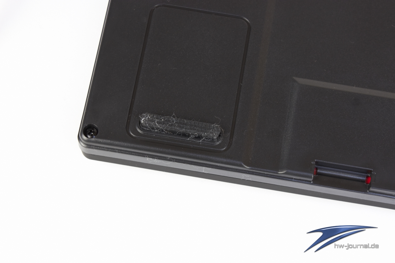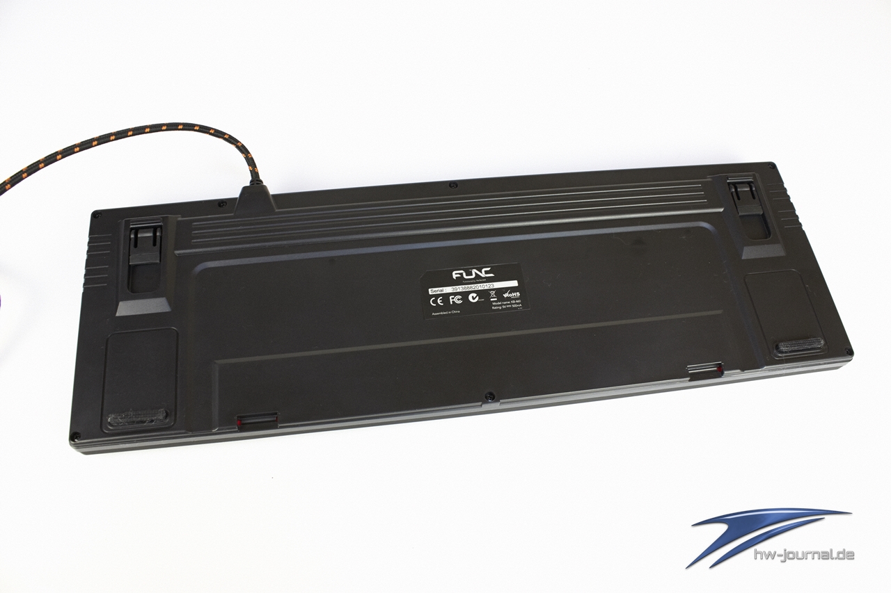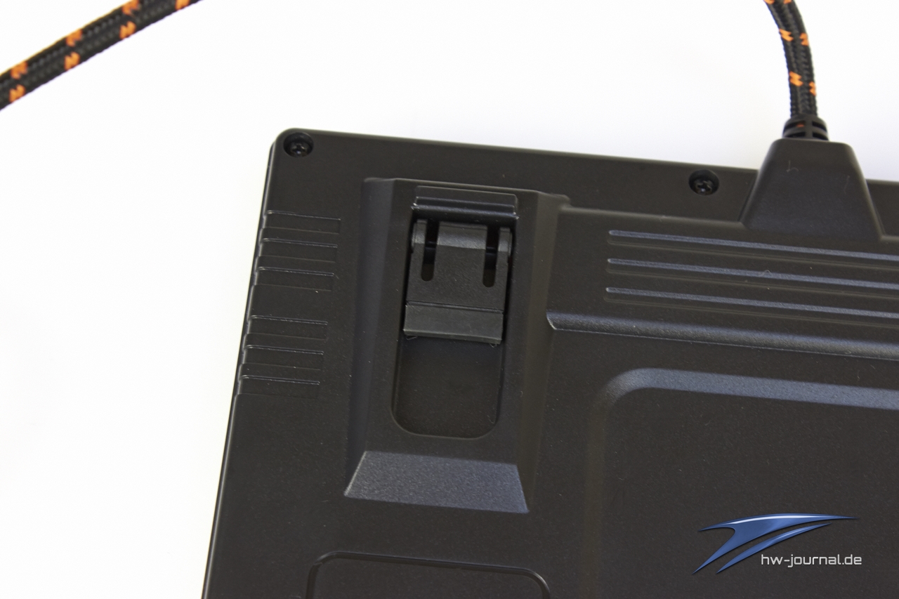 Auf der Unterseite zeigen sich neben zwei aufstellbaren Füßen nur noch vier Gummifüße, die auch beim etwas heftigeren Schreiben die Ruhe bewahren sollen und die KB-460 möglichst ruhig an ihrem Platz halten sollen. Hinten befinden sich noch der Ausgang des USB-Kabels, das mit 1,8 Metern eine ordentliche Länge aufweist und zudem gesleevt ist. Zwei USB-2.0-Ports, an die man schnell einen Stick oder ähnliches anstecken kann, befinden sich ebenfalls auf der Stirnseite des Chassis.