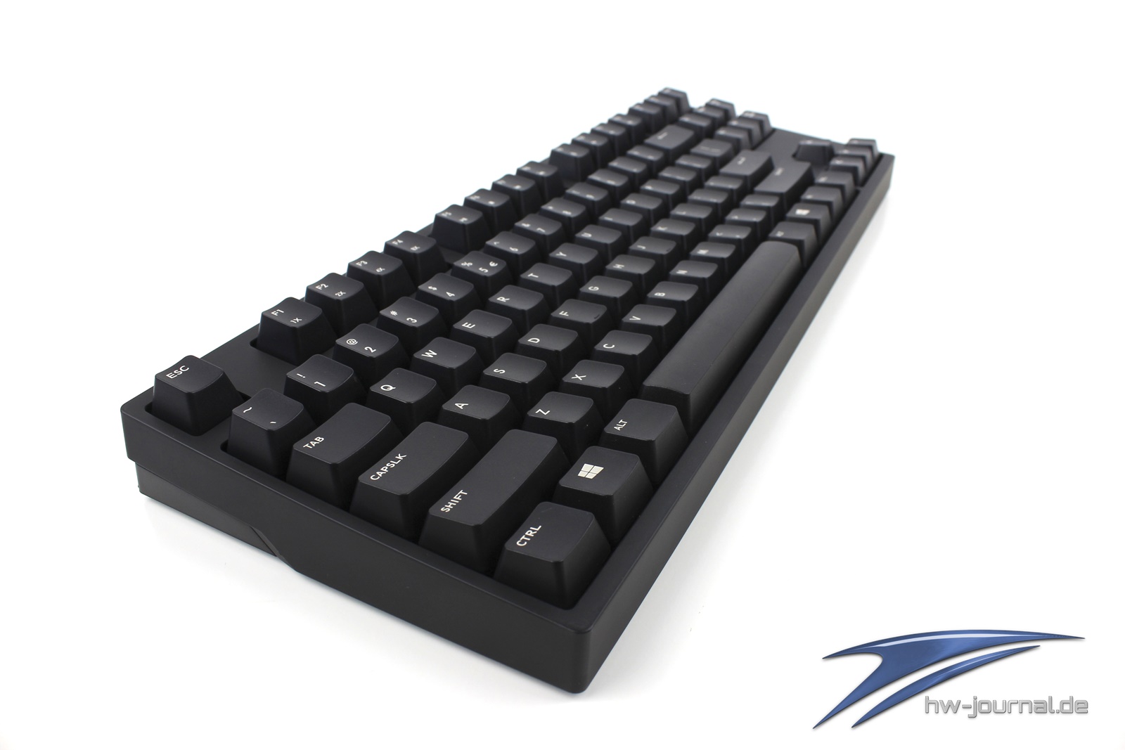 Nun jedoch zum Tippgefühl, denn das ist bei den speziellen Switches komplett anders als bei den meisten mechanischen Modellen von Cherry. Die Kecaps liegen sehr locker auf dem Schalter und das Betätigen ist anfangs sehr einfach. Um den Kontakt auf der Platine wirklich herzustellen, muss jedoch ein kleiner Widerstand überwunden werden. Dieser fühlt sich in etwa an wie einen Finger, den man in einen Gummiball drücken oder wieder loslassen würde. Anfangs ist es etwas ungewöhnlich aber nach einiger Zeit gewöhnt man sich dran und findet Gefallen am Tippen. Das Numpad fehlt in keinster Weise und durch den kompakten Aufbau kann man die Tastatur platzsparend auf dem Schreibtisch unterbringen.