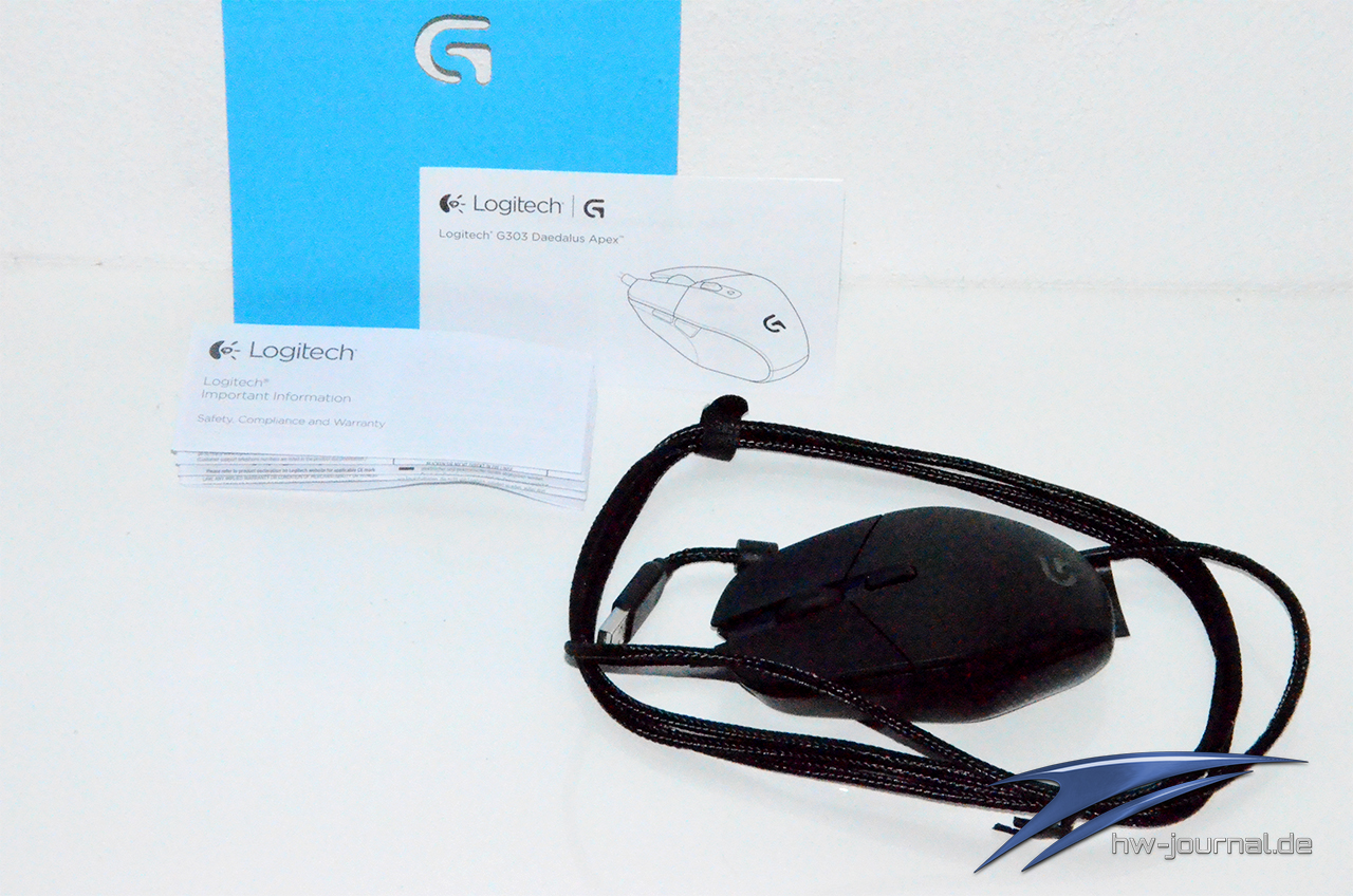 Die G303 wird in einer schlichten Kartonage verpackt, auf der Logitech einige Abbildungen und Produktinformationen platziert. Das Aussehen hält sich hier an das neue "G-Design", welches auf eine schwarz-grellblaue Farbkombination setzt. Der Lieferumfang besteht aus der Maus und einer Bedienungsanleitung.