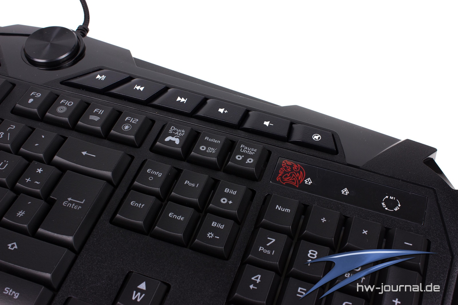 Das Keyboard besitzt ein leicht aggressives Design mit vielen Kanten und Ecken. Thermaltake setzt auf ein deutsches QWERTZ-Layout und packt noch zusätzliche Tasten dazu. Darunter sechs programmierbare Makro-Keys, diverse Buttons zur Audio-Wiedergabe oder dem Öffnen von Programmen, sowie Sondertasten zur Steuerung der Beleuchtung. Rechts oben sind die drei üblichen Status-LEDs untergebracht. Mittig und oberhalb der Keys hat man ein Drehrad platziert, allerdings steuert dies nicht die Lautstärke sondern die Helligkeit der Beleuchtung.